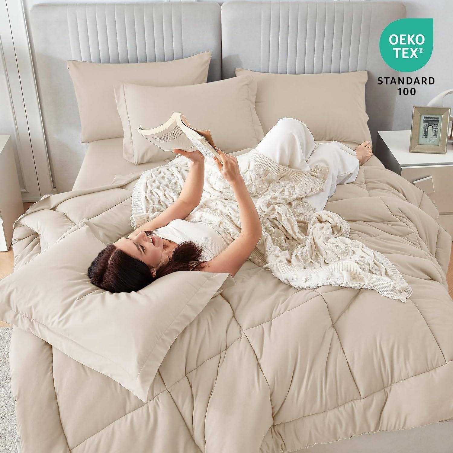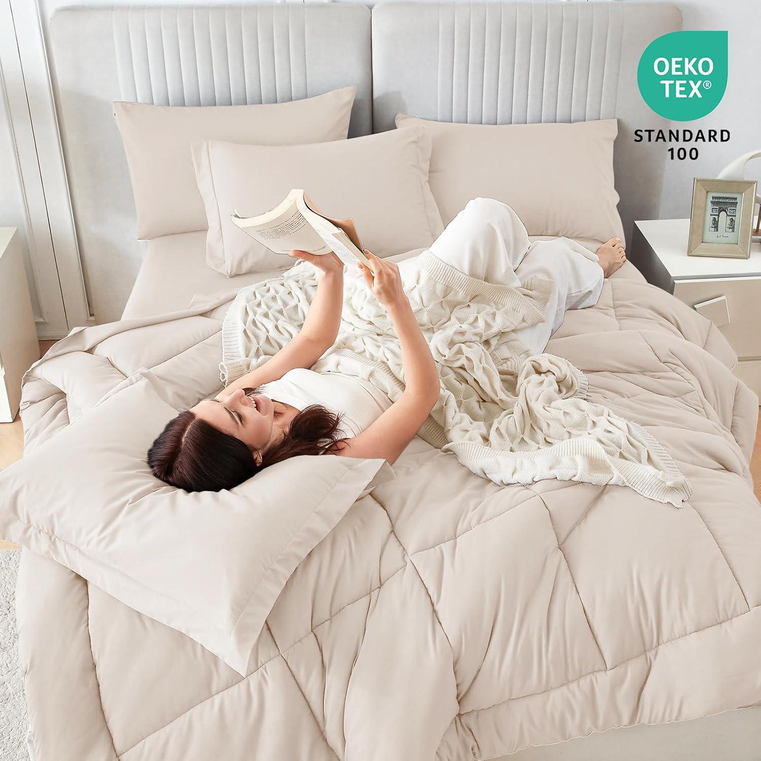 Sasttie California King Comforter Set, 7 Pieces Cal King Bed in a Bag, Complete Bedding Set Includes Grey Comforter, Flat Sheet, Fitted Sheet, Pillowcases and Pillow Shams, Dark Grey(Beige)