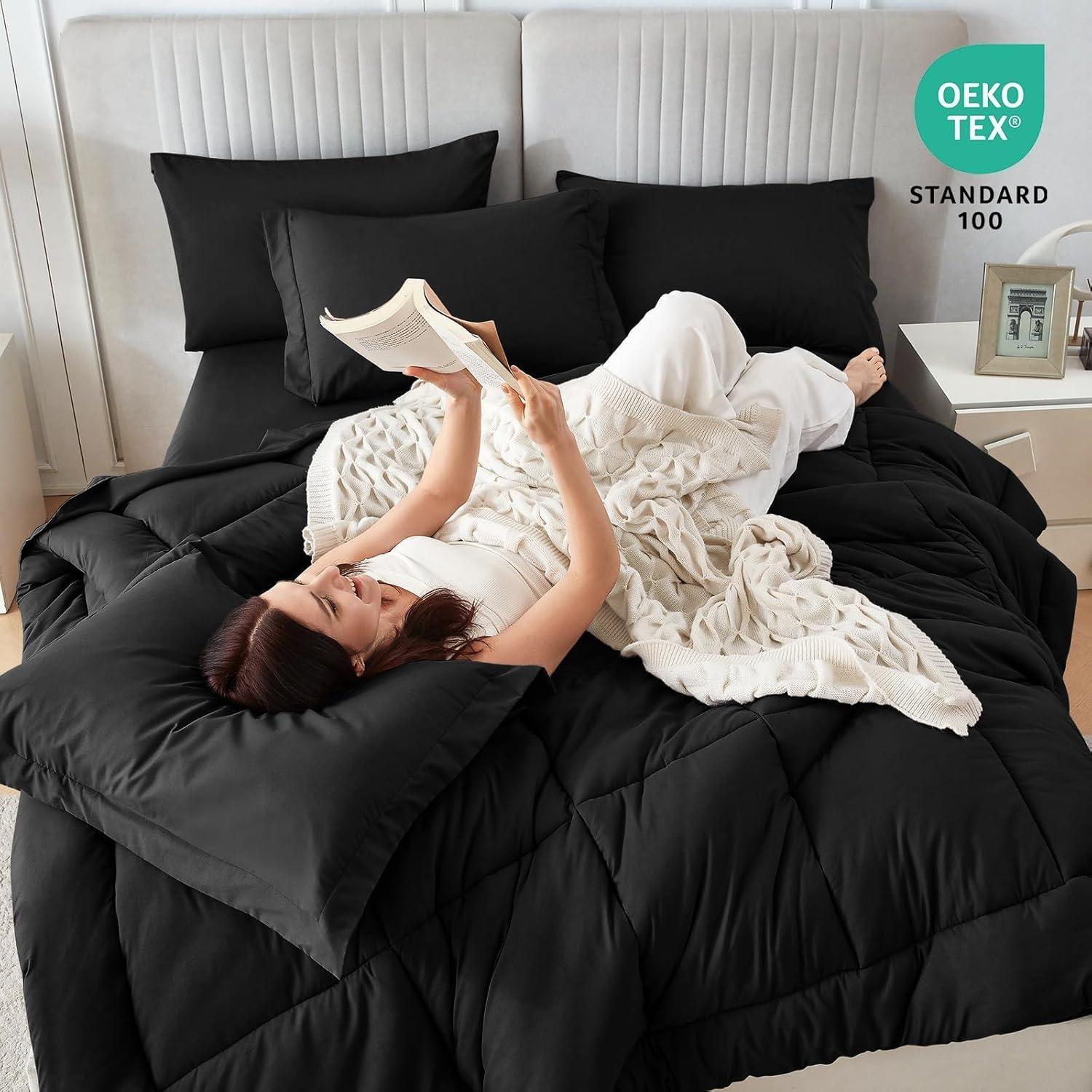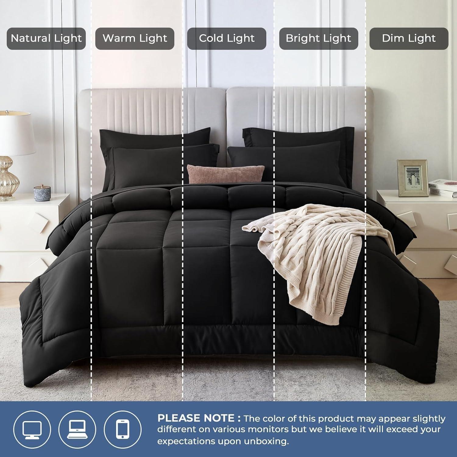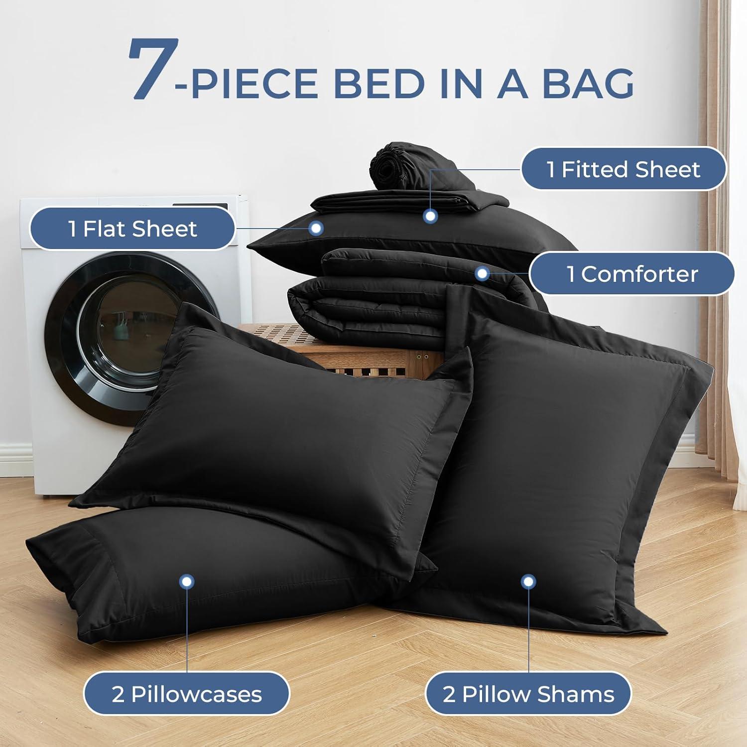 Sasttie California King Comforter Set, 7 Pieces Cal King Bed in a Bag, Complete Bedding Set Includes Grey Comforter, Flat Sheet, Fitted Sheet, Pillowcases and Pillow Shams, Dark Grey(Black)