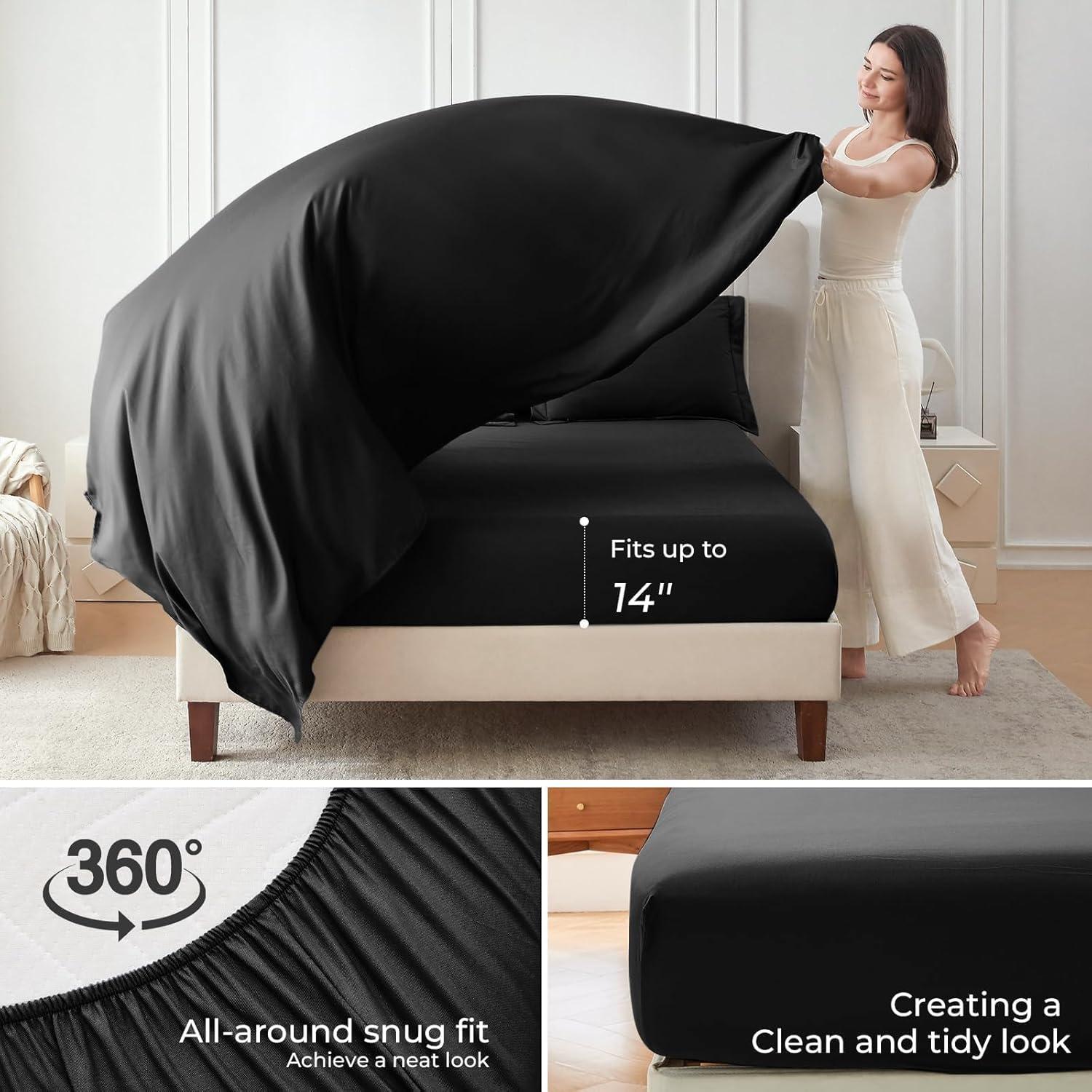 Thoughtful Details: The 360° elastic fitted sheet fits mattresses up to 14'' deep, ensuring all-around snug fit. The smooth, breathable flat sheet ensures ultimate comfort while remaining whisper-quiet, allowing for a restful night's sleep