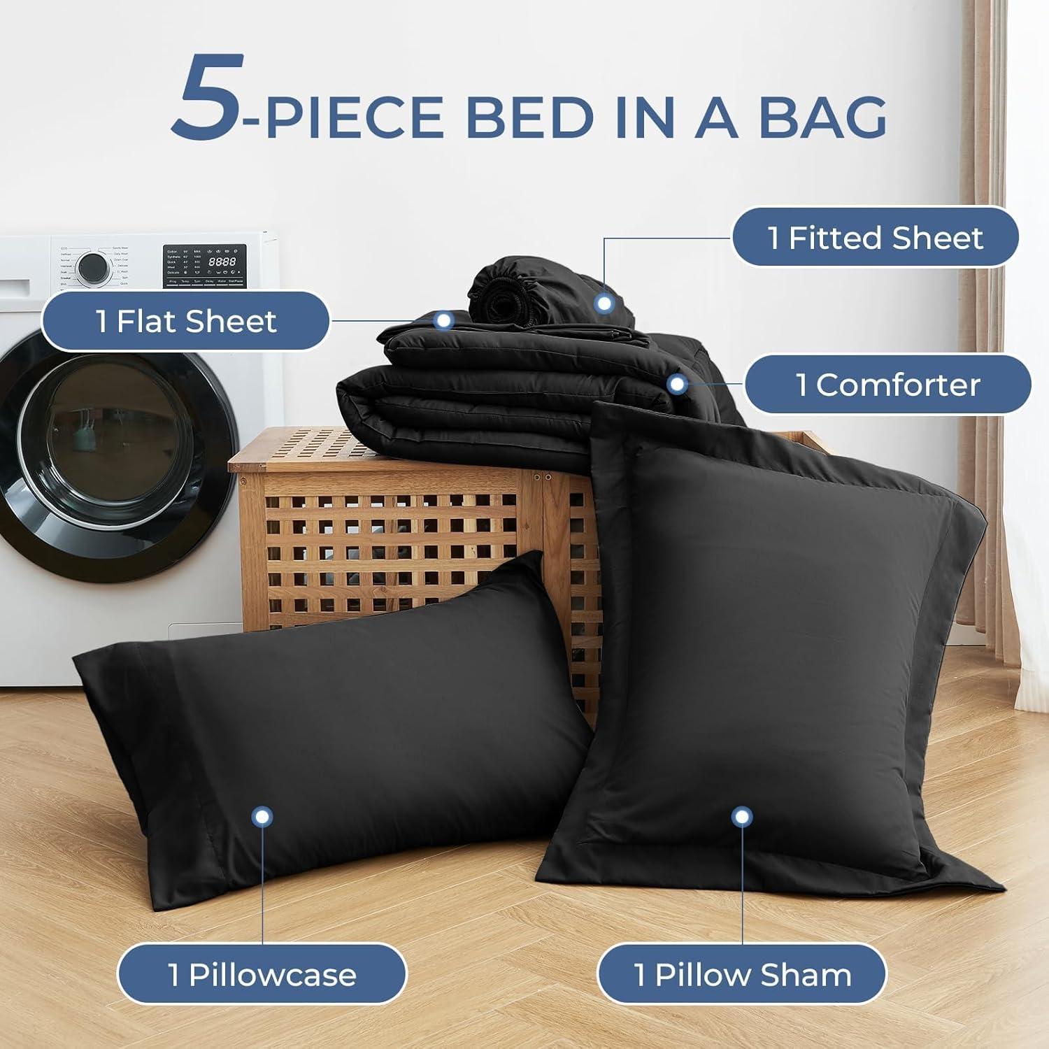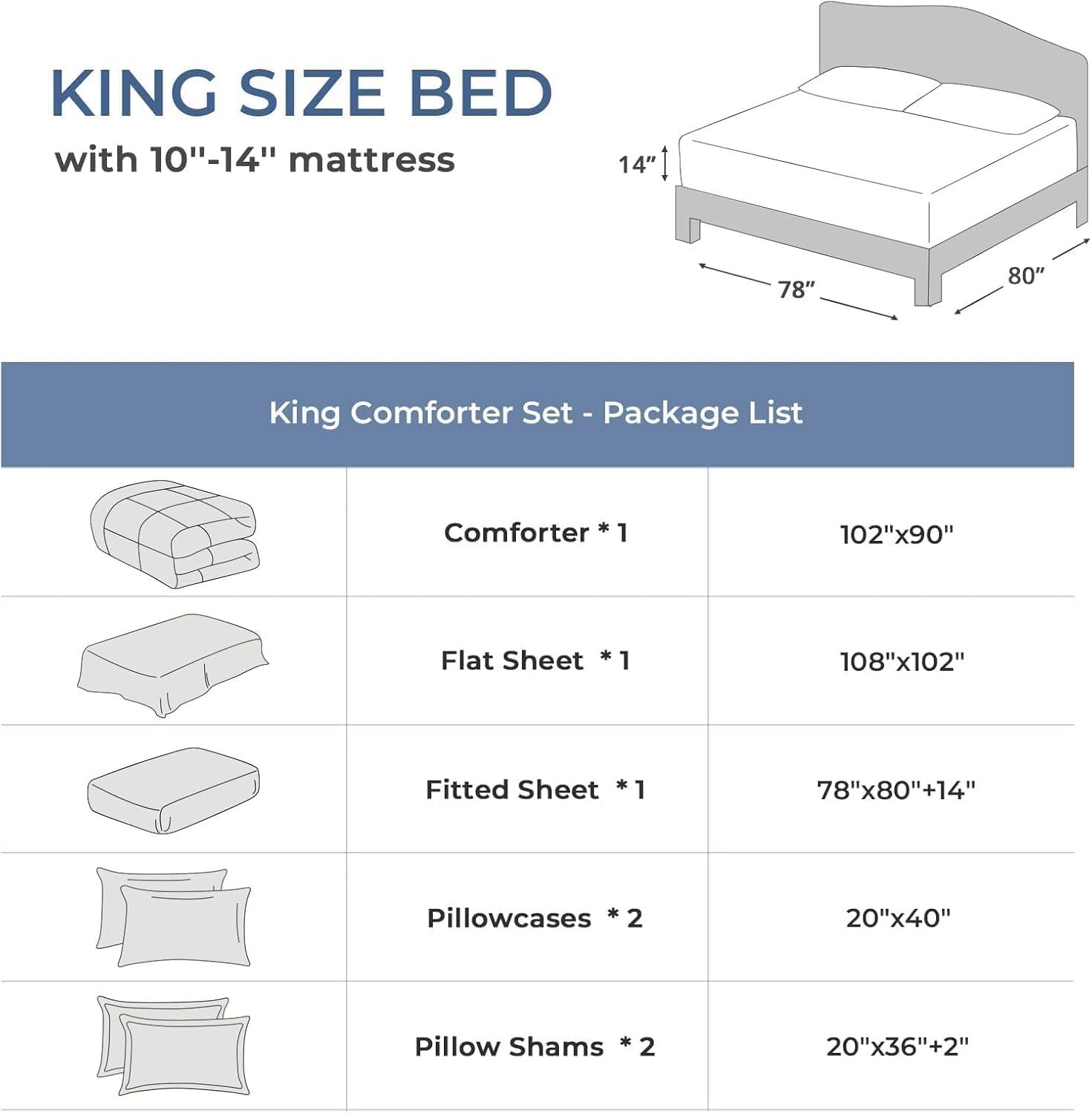 Bed in a Bag California King: Includes 1 comforter (104″x96″), 1 flat sheet (108″x102″), 1 fitted sheet (72″x84″+14″), 2 pillowcases (20″x40″), and 2 pillow shams (20″x36″+2″) to complete your california king bed in one step
