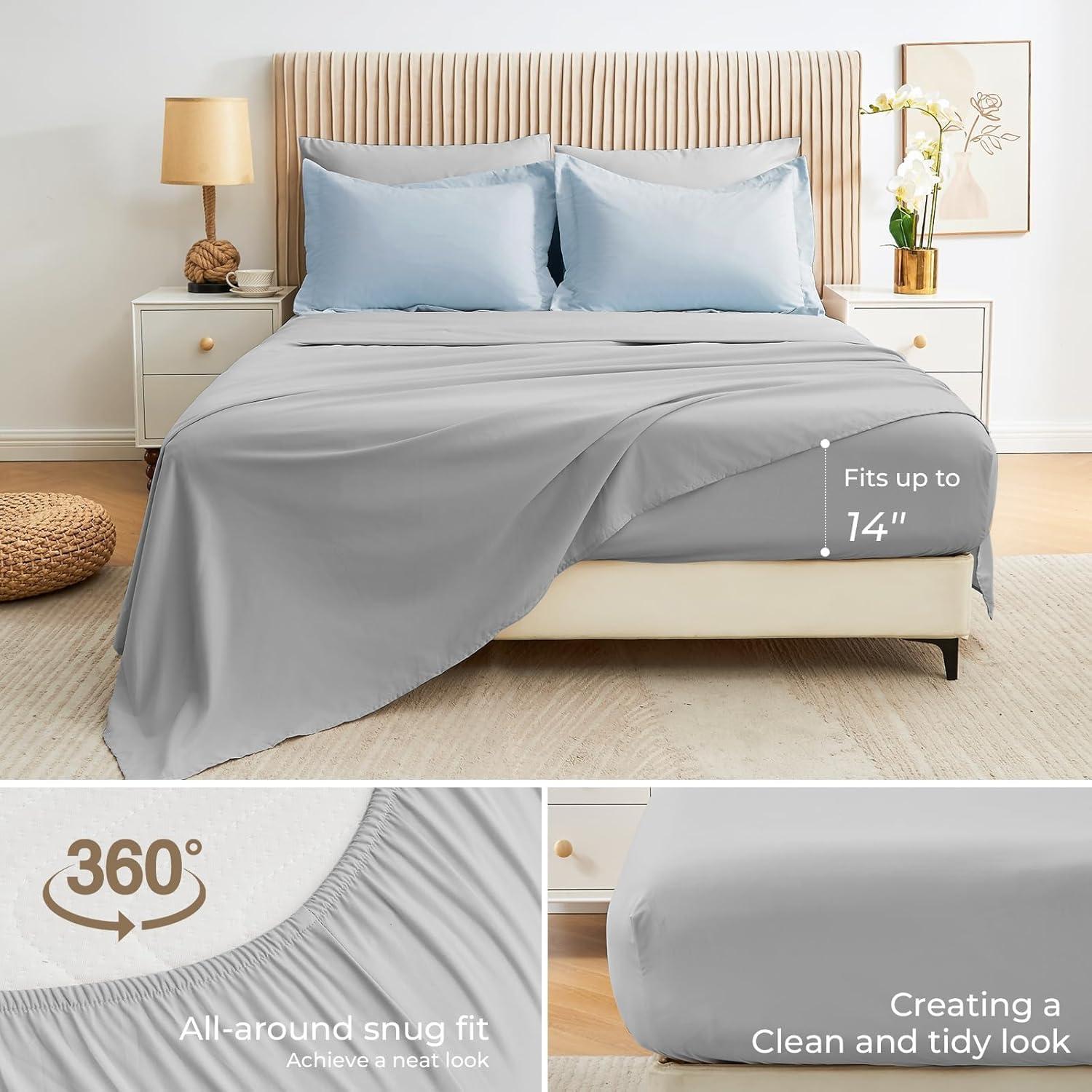 Thoughtful Details: The 360° elastic fitted sheet fits mattresses up to 14'' deep, ensuring all-around snug fit. The smooth, breathable flat sheet ensures ultimate comfort while remaining whisper-quiet, allowing for a restful night's sleep