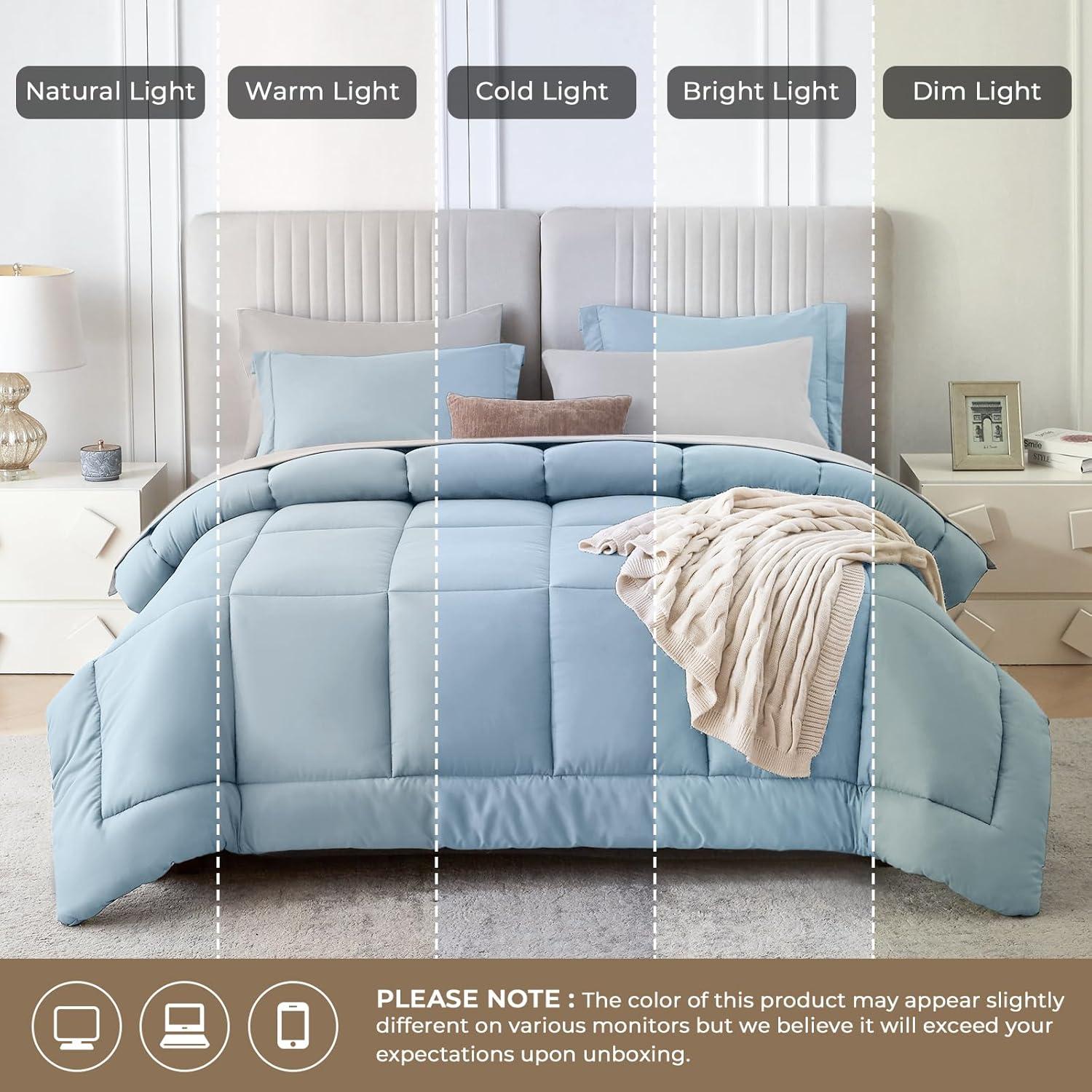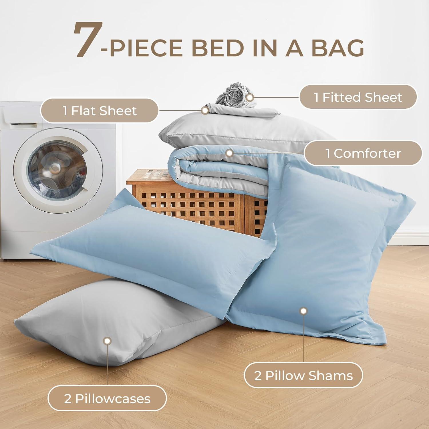 Sasttie California King Comforter Set, 7 Pieces Cal King Bed in a Bag, Complete Bedding Set Includes Grey Comforter, Flat Sheet, Fitted Sheet, Pillowcases and Pillow Shams, Dark Grey(Blue & Light Grey)