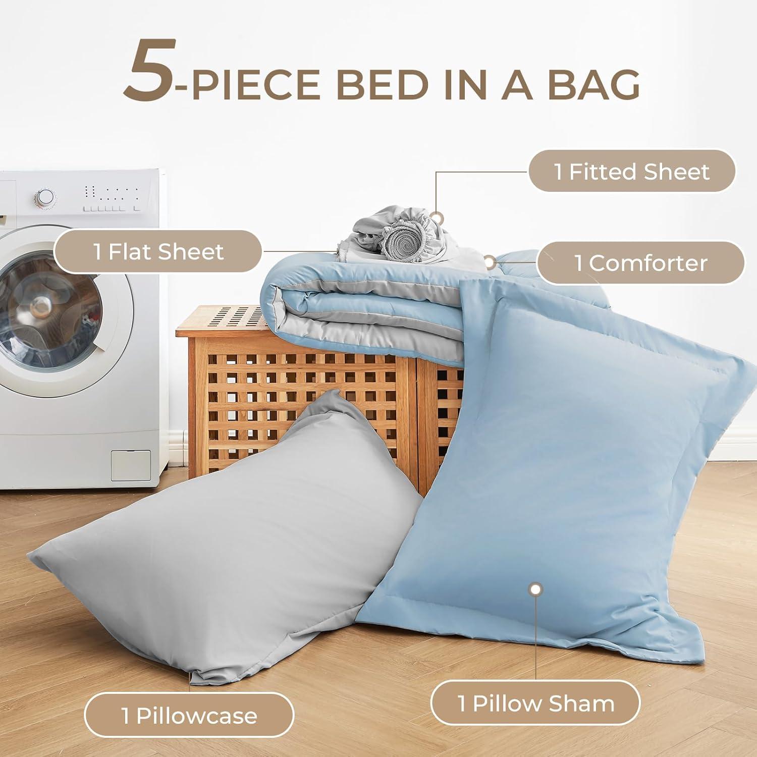 Bed in a Bag California King: Includes 1 comforter (104″x96″), 1 flat sheet (108″x102″), 1 fitted sheet (72″x84″+14″), 2 pillowcases (20″x40″), and 2 pillow shams (20″x36″+2″) to complete your california king bed in one step