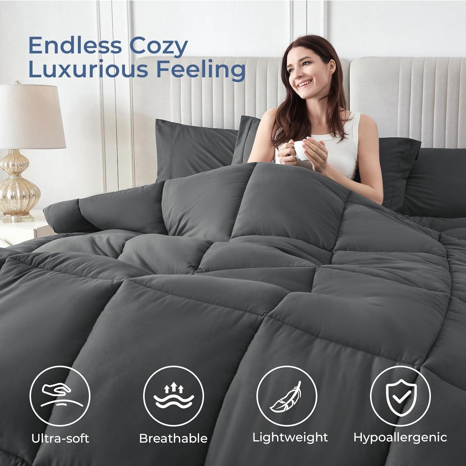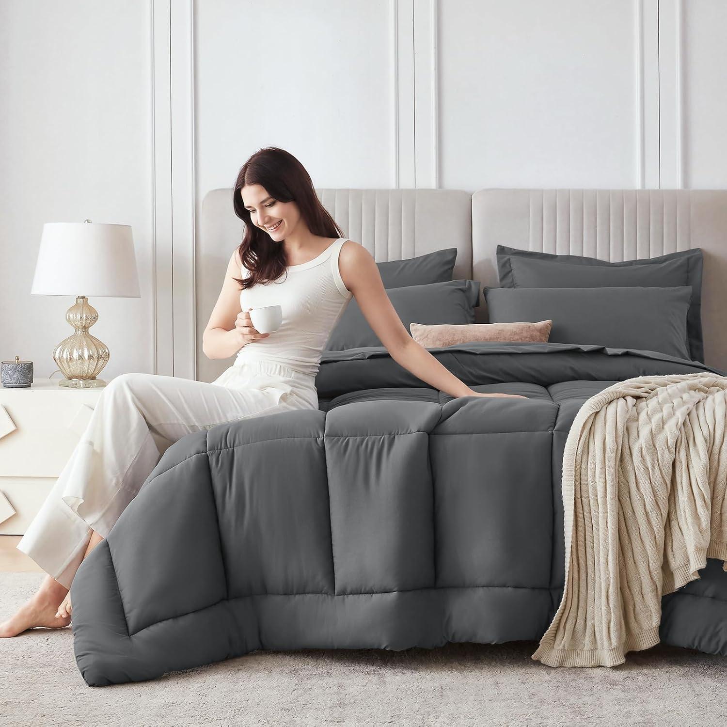 Sasttie California King Comforter Set, 7 Pieces Cal King Bed in a Bag, Complete Bedding Set Includes Grey Comforter, Flat Sheet, Fitted Sheet, Pillowcases and Pillow Shams, Dark Grey(Dark Grey)