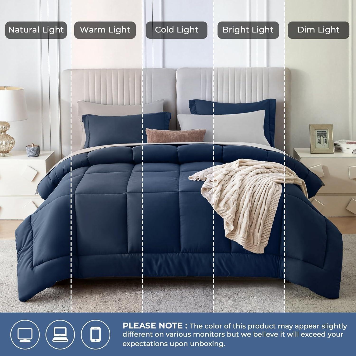 Sasttie California King Comforter Set, 7 Pieces Cal King Bed in a Bag, Complete Bedding Set Includes Grey Comforter, Flat Sheet, Fitted Sheet, Pillowcases and Pillow Shams, Dark Grey(Navy)