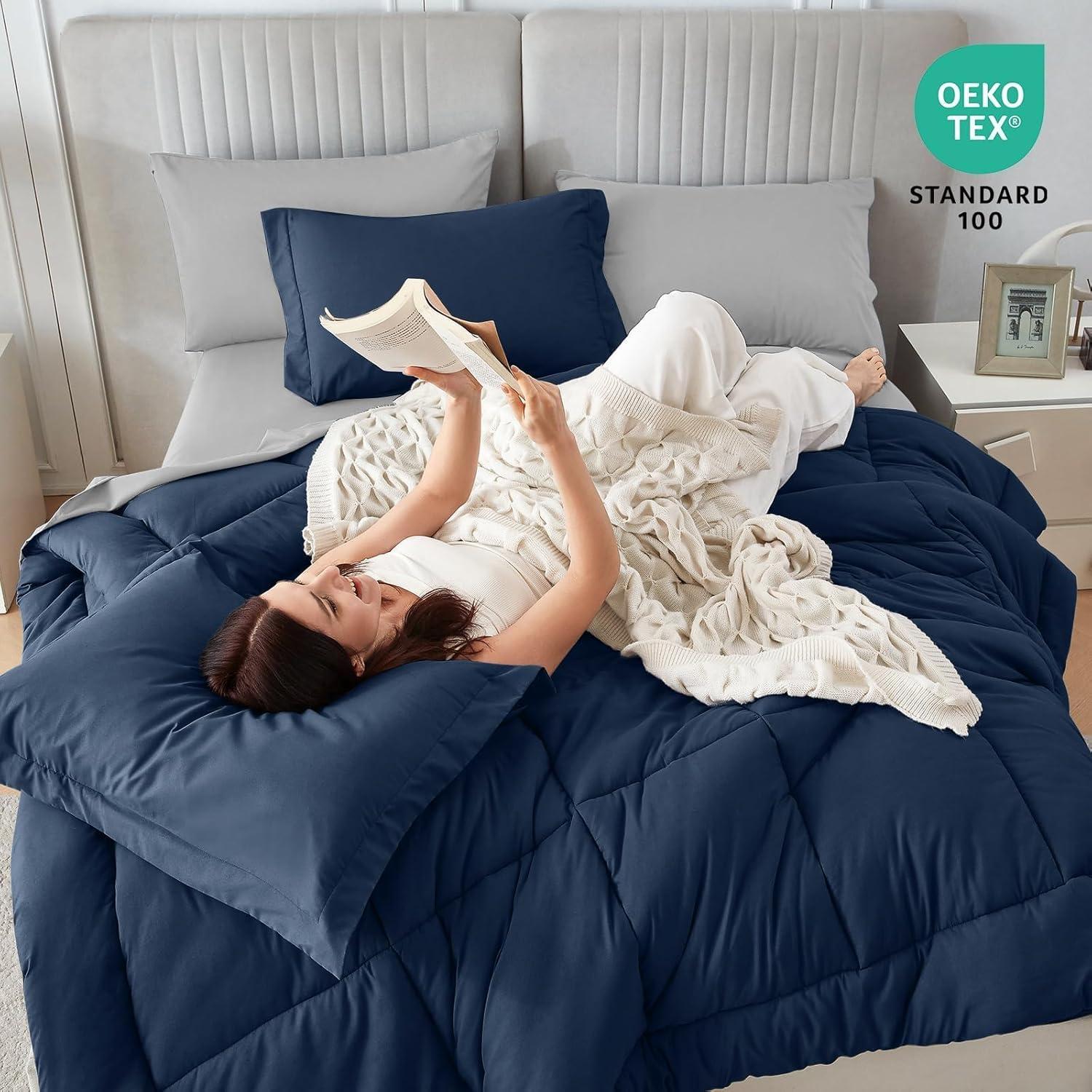 Sasttie California King Comforter Set, 7 Pieces Cal King Bed in a Bag, Complete Bedding Set Includes Grey Comforter, Flat Sheet, Fitted Sheet, Pillowcases and Pillow Shams, Dark Grey(Navy & Light Grey)