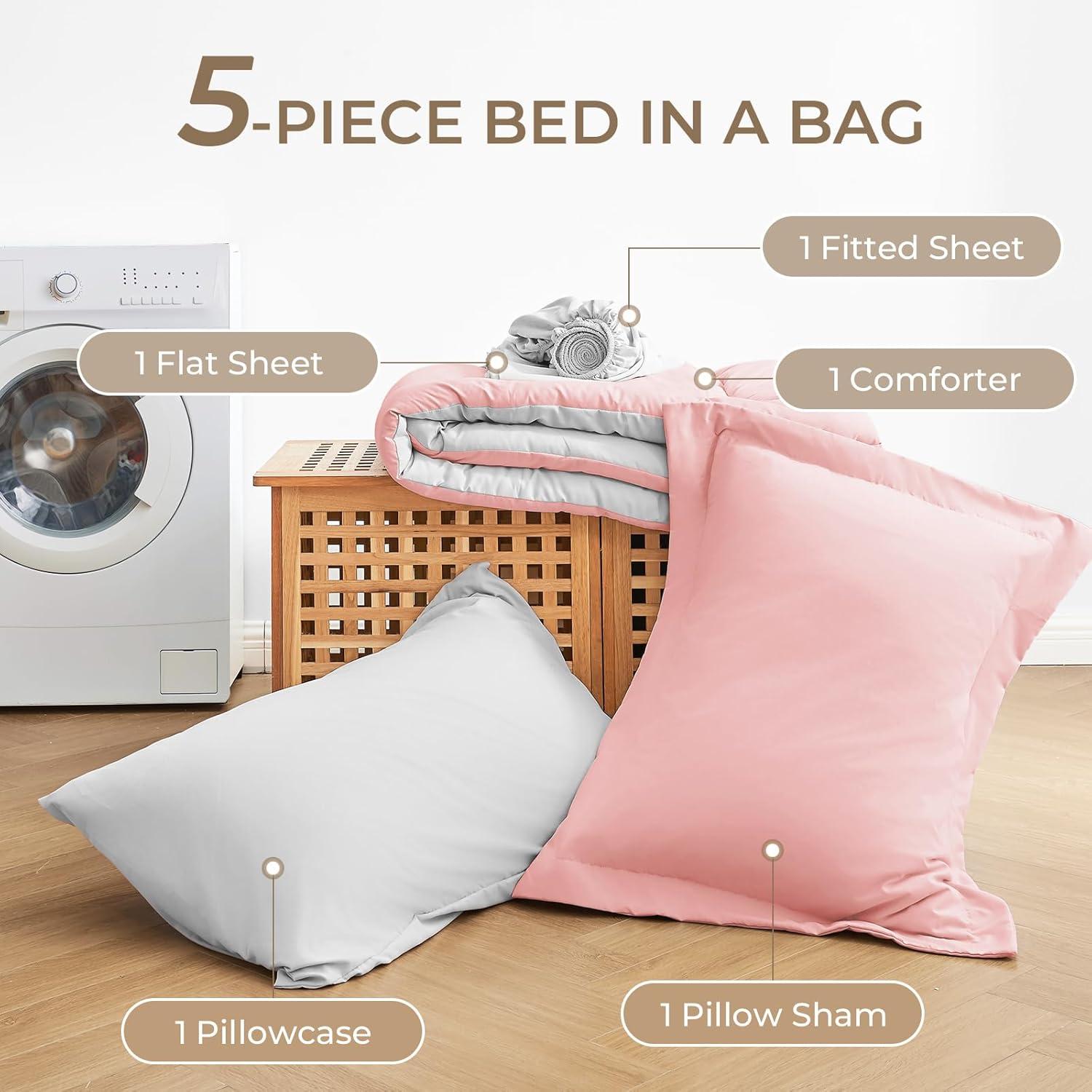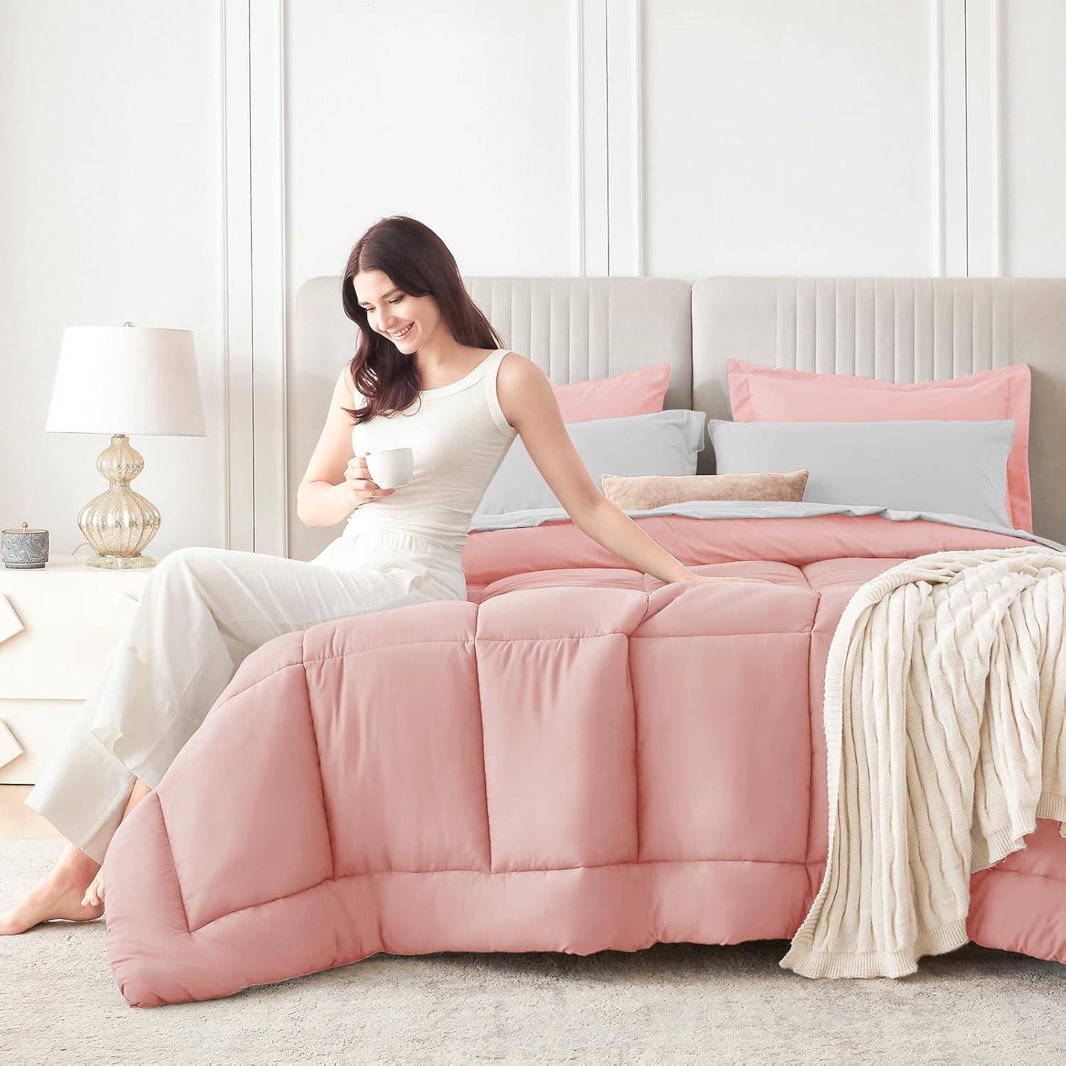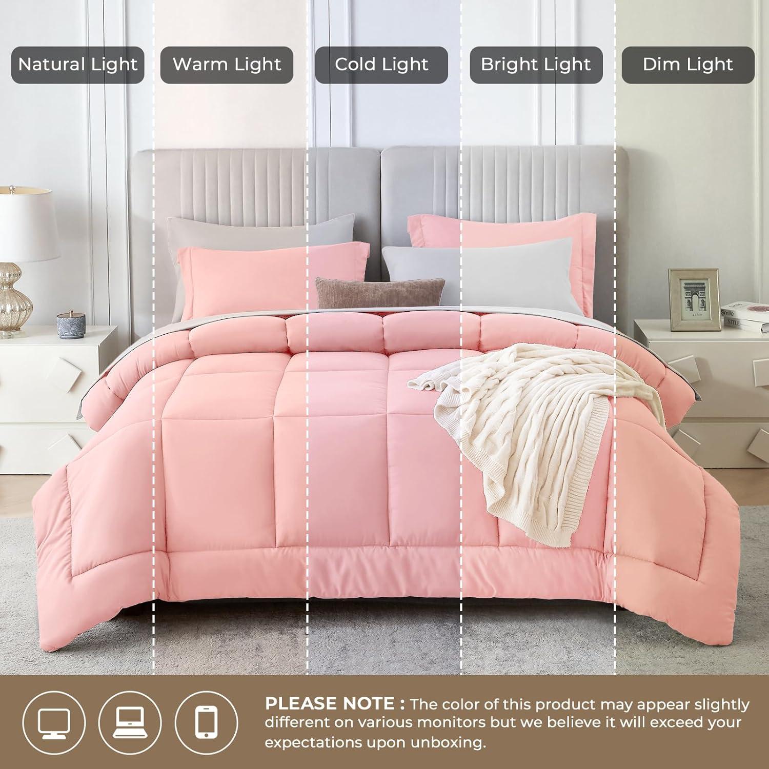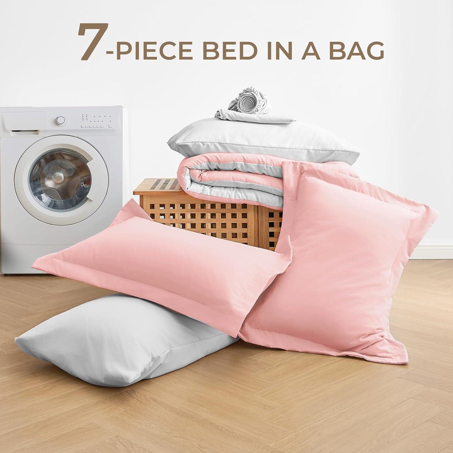 Sasttie California King Comforter Set, 7 Pieces Cal King Bed in a Bag, Complete Bedding Set Includes Grey Comforter, Flat Sheet, Fitted Sheet, Pillowcases and Pillow Shams, Dark Grey(Pink & Light Grey)