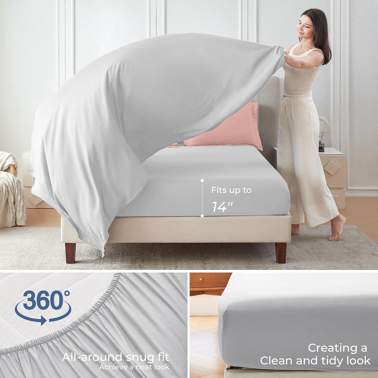 Thoughtful Details: The 360° elastic fitted sheet fits mattresses up to 14'' deep, ensuring all-around snug fit. The smooth, breathable flat sheet ensures ultimate comfort while remaining whisper-quiet, allowing for a restful night's sleep