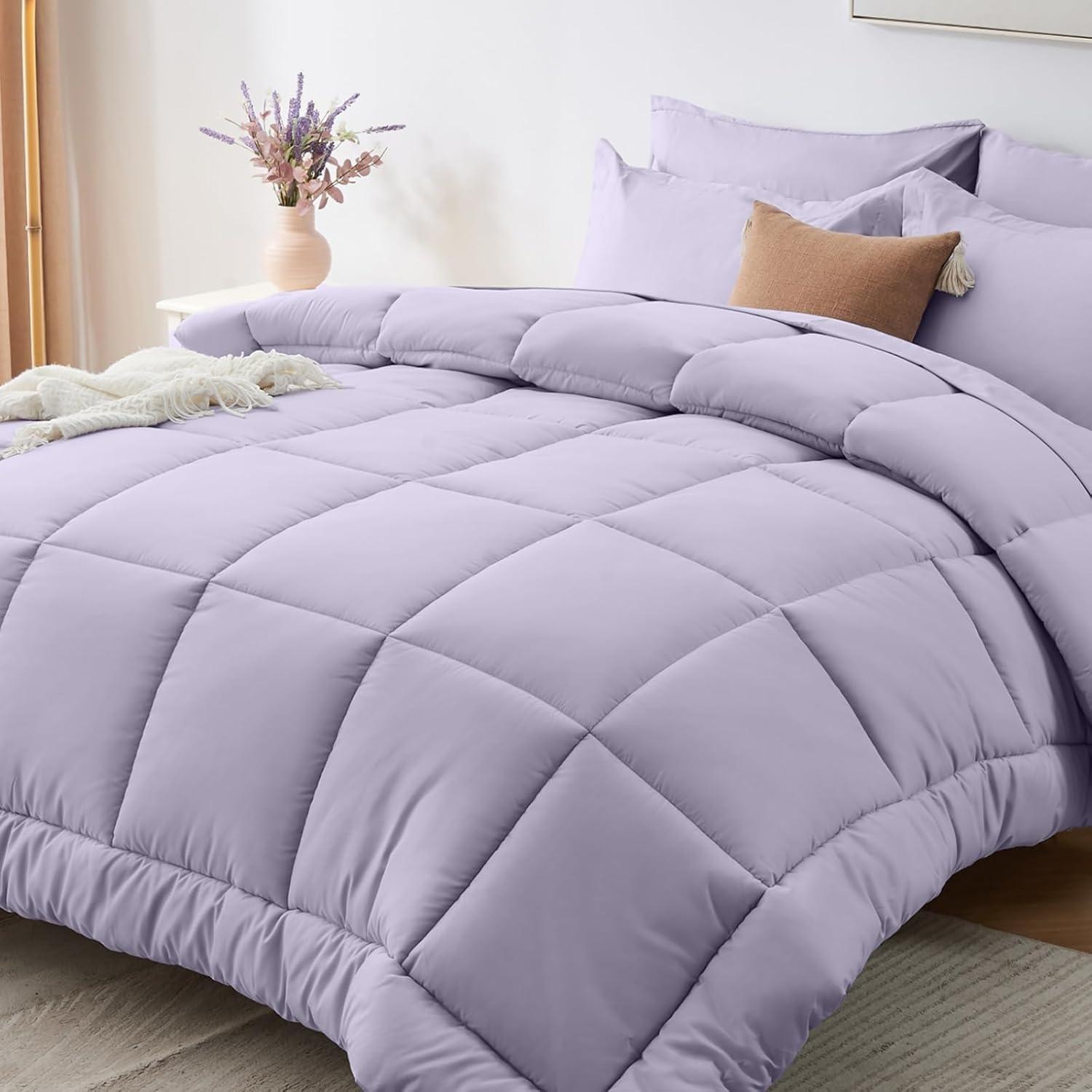 Sasttie California King Comforter Set, 7 Pieces Cal King Bed in a Bag, Complete Bedding Set Includes Grey Comforter, Flat Sheet, Fitted Sheet, Pillowcases and Pillow Shams, Dark Grey(Purple & Light Grey)