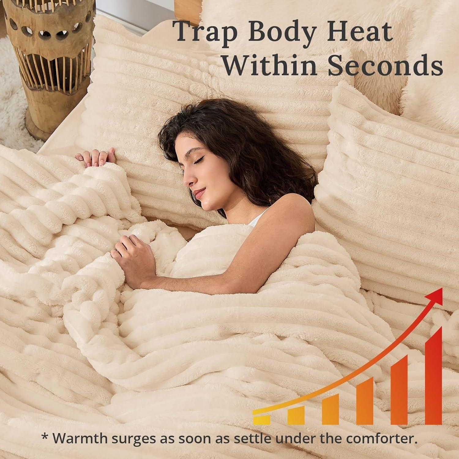 Warmer & Cozier: The finer, denser fleece in our fuzzy bedding set captures more body heat, effectively reducing warmth loss. Meanwhile, the heavyweight 8 oz/yd² plush fiber filling hugs heat close to you all night long even on freezing nights