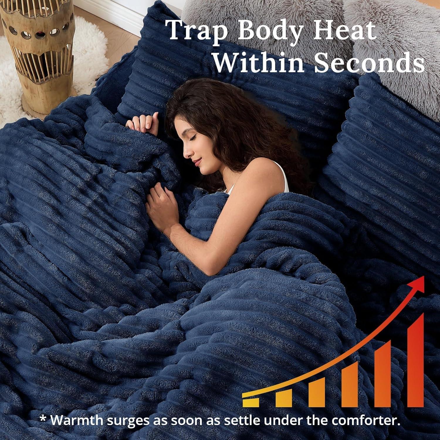 Warmer & Cozier: The finer, denser fleece in our fuzzy bedding set captures more body heat, effectively reducing warmth loss. Meanwhile, the heavyweight 8 oz/yd² plush fiber filling hugs heat close to you all night long even on freezing nights