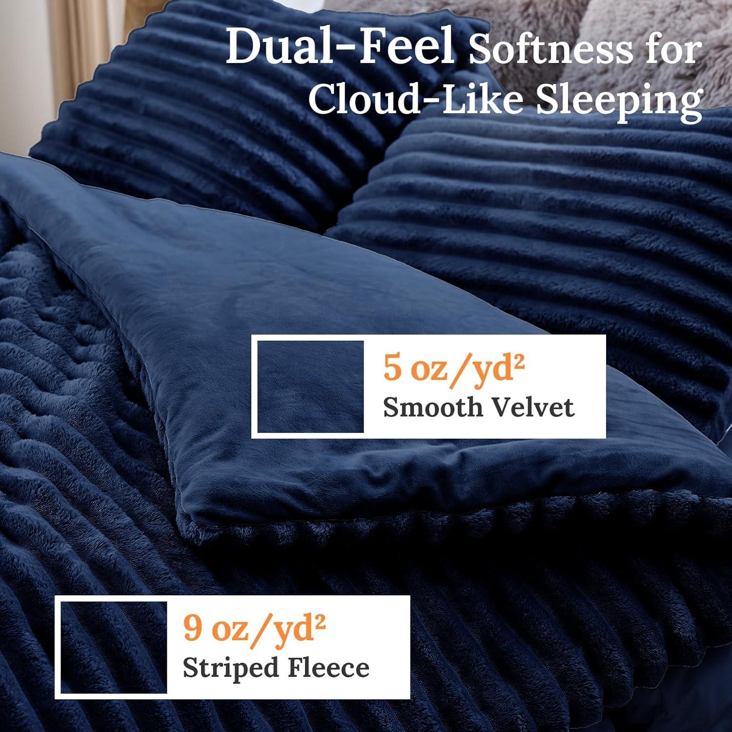 Plush & Cuddly: 9 oz/yd² luxury fleece outer layer with 5 oz/yd² shiny velvet inner lining delivers hotel-like luxury. Run your hands over the supersoft fluffy striped comforter just like petting a kitten or sinking into the buttery velvet