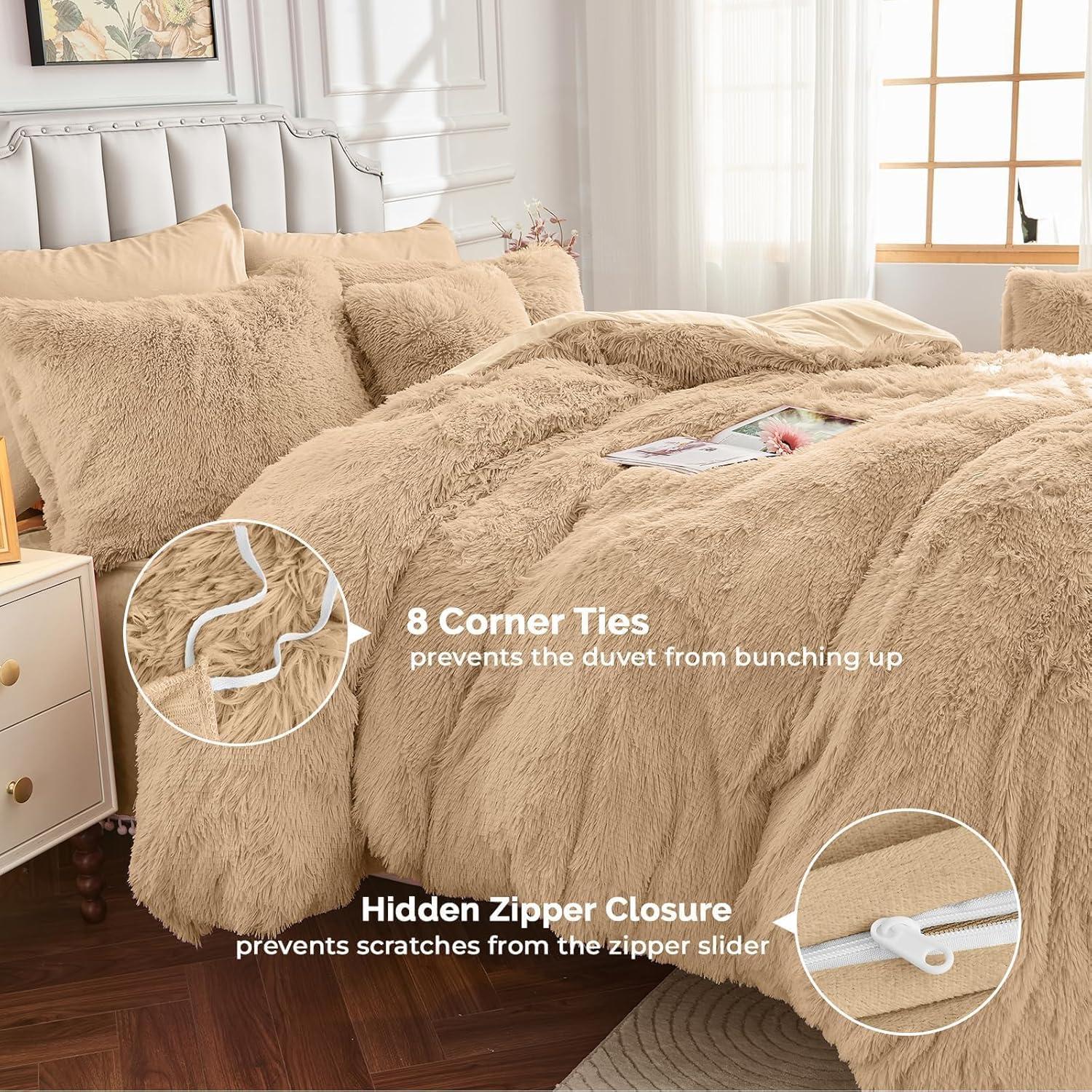 Sasttie Fluffy Duvet Cover Queen Size, Shaggy Queen Duvet Cover, Fuzzy Faux Fur and Velvet Duvet Cover Set with Zipper Closure and Corner Ties - 1 Duvet Cover and 2 Pillowcases, Camel