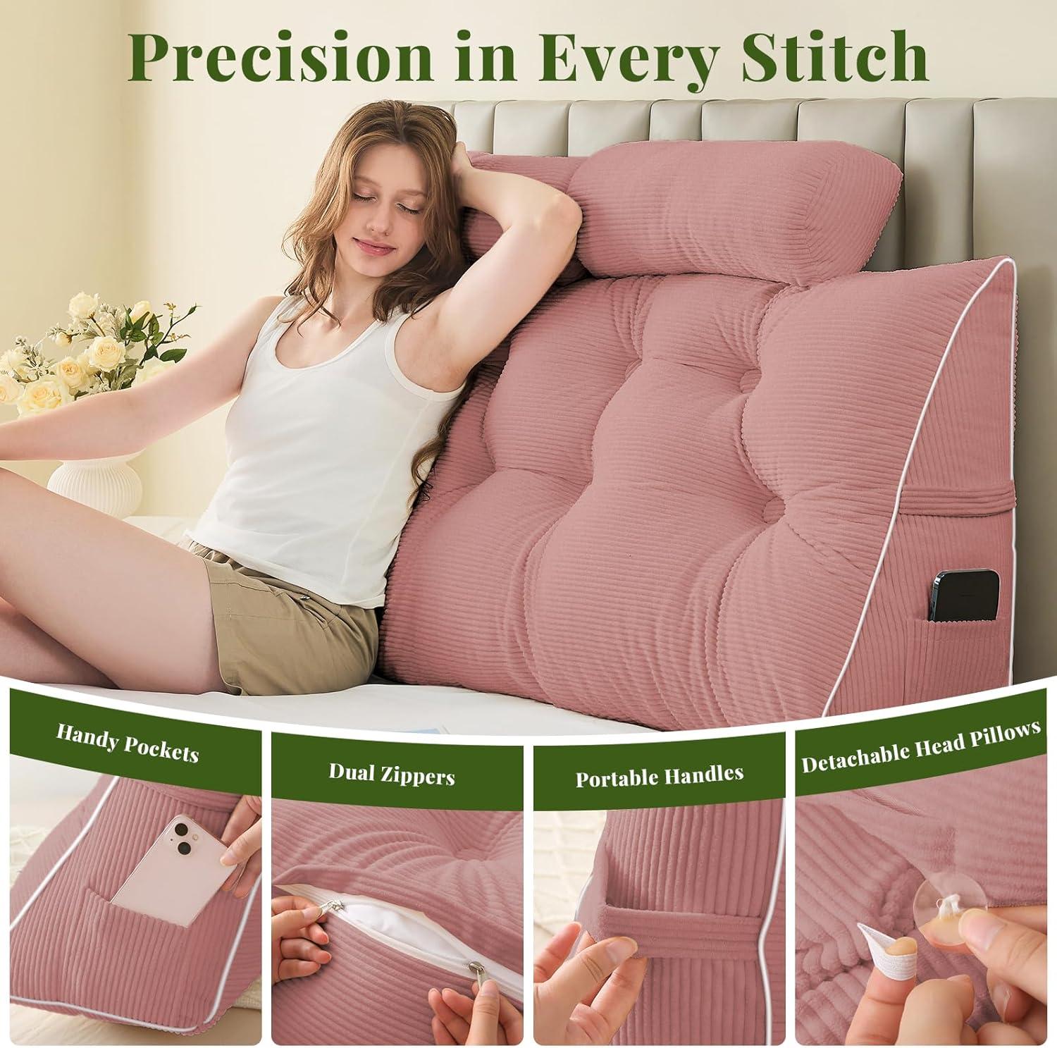 Detail Matters: This headboard pillow includes 2 side pockets for remotes, phones, or glasses, keeping essentials within reach. Dual zippers allow filling adjustment and cover removal, while side handles enable easy repositioning on beds, sofas, or floors