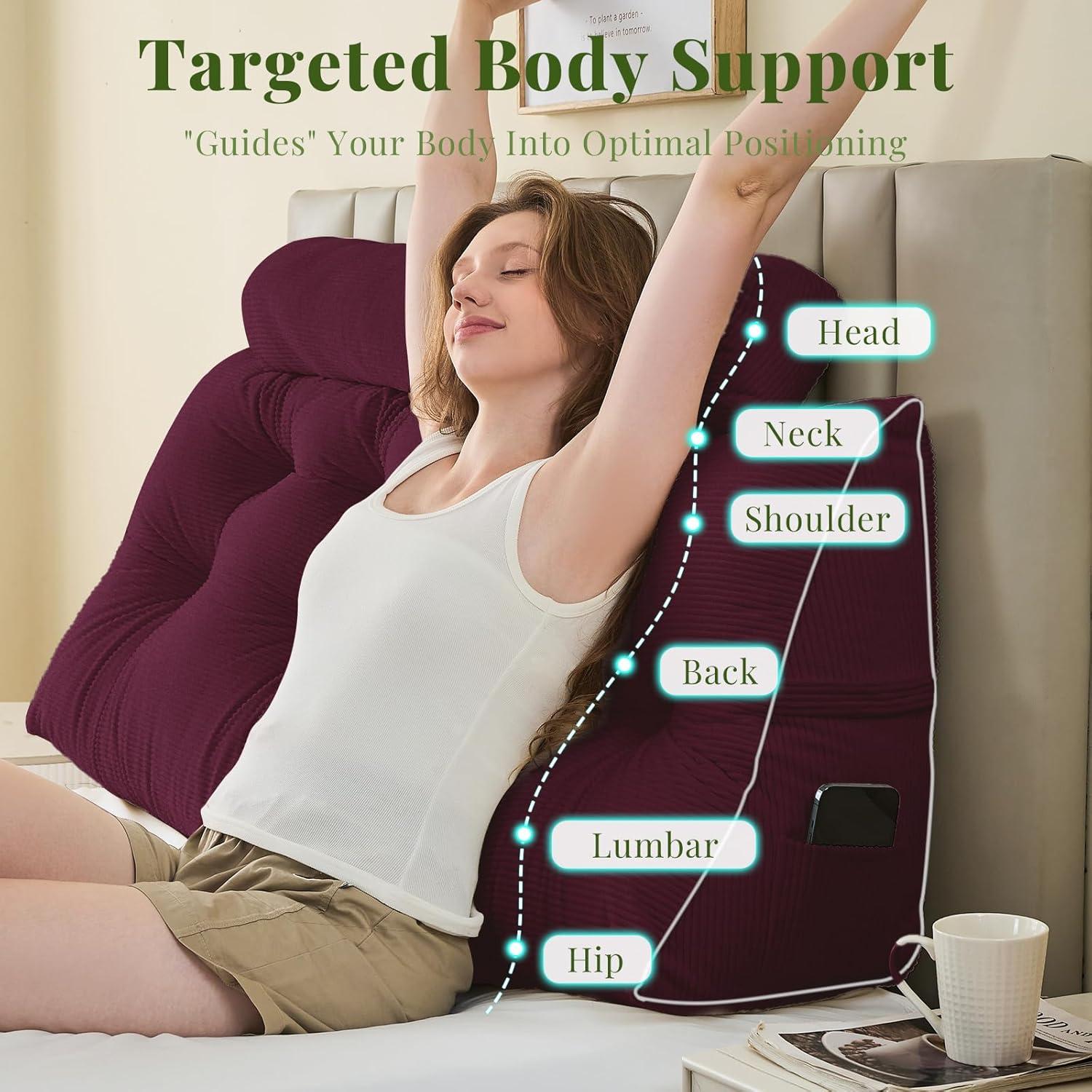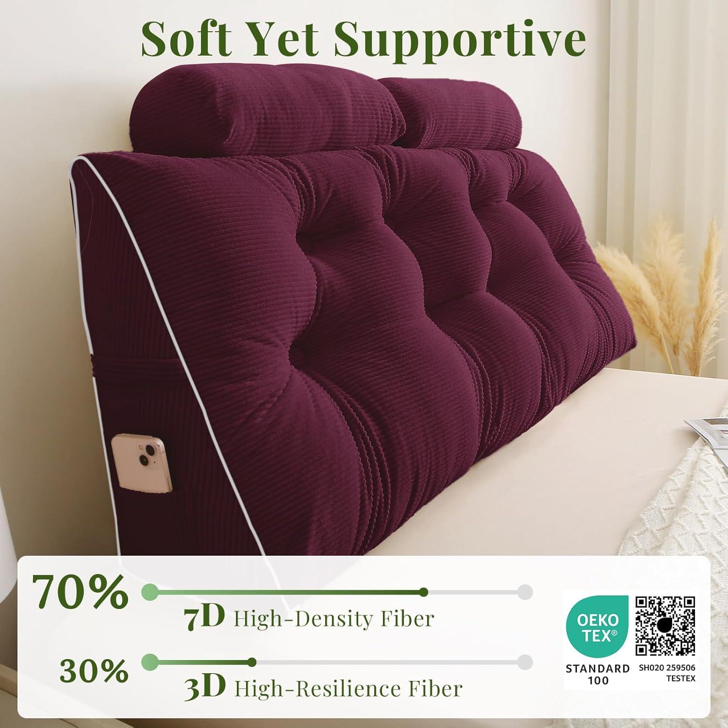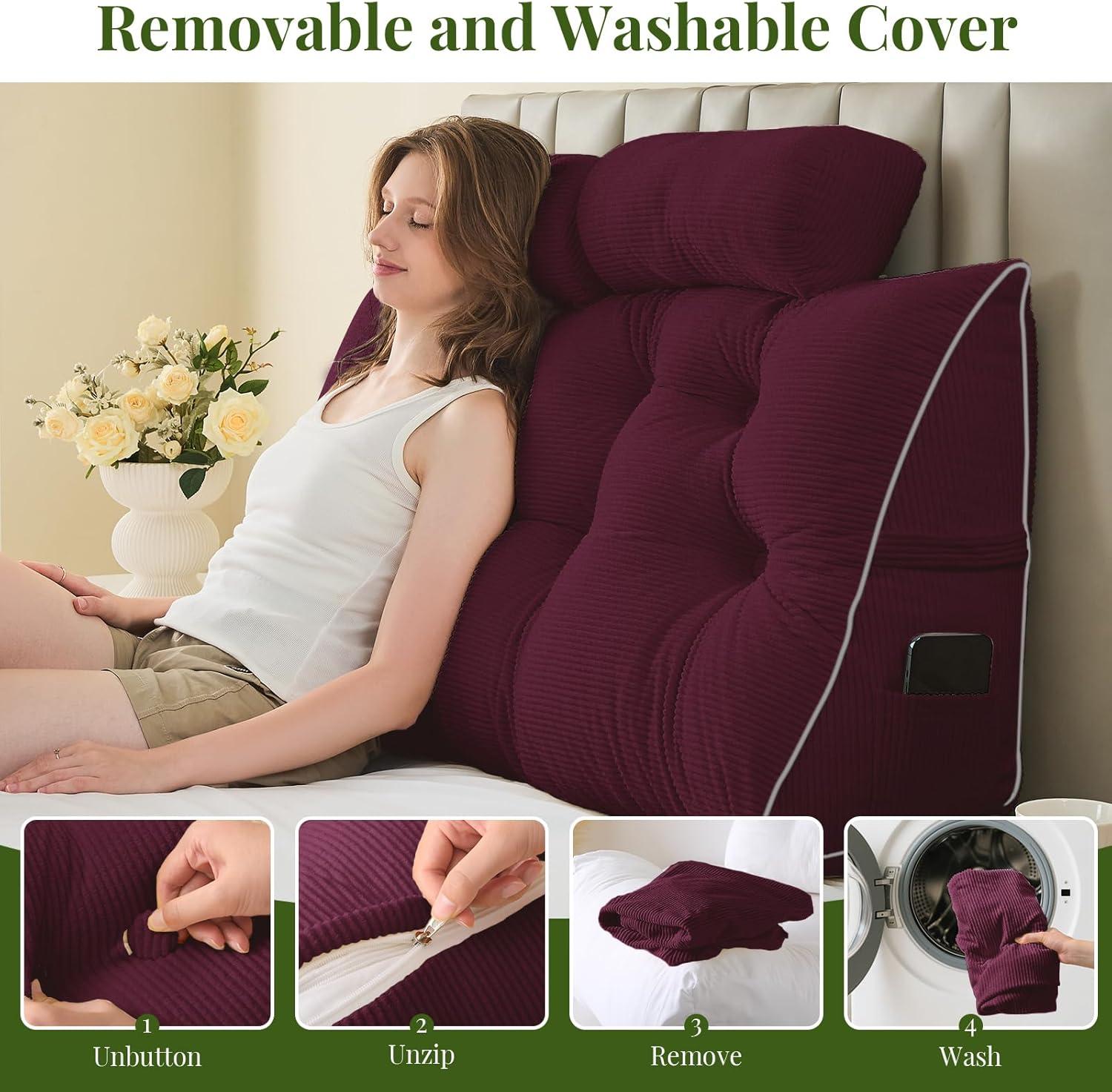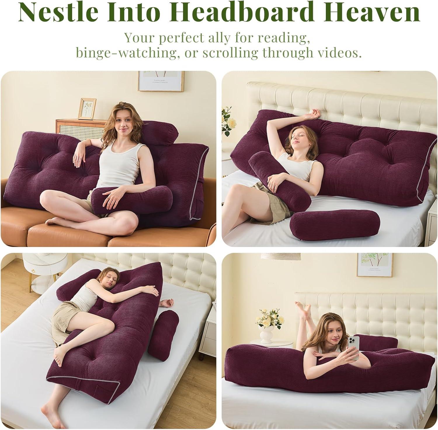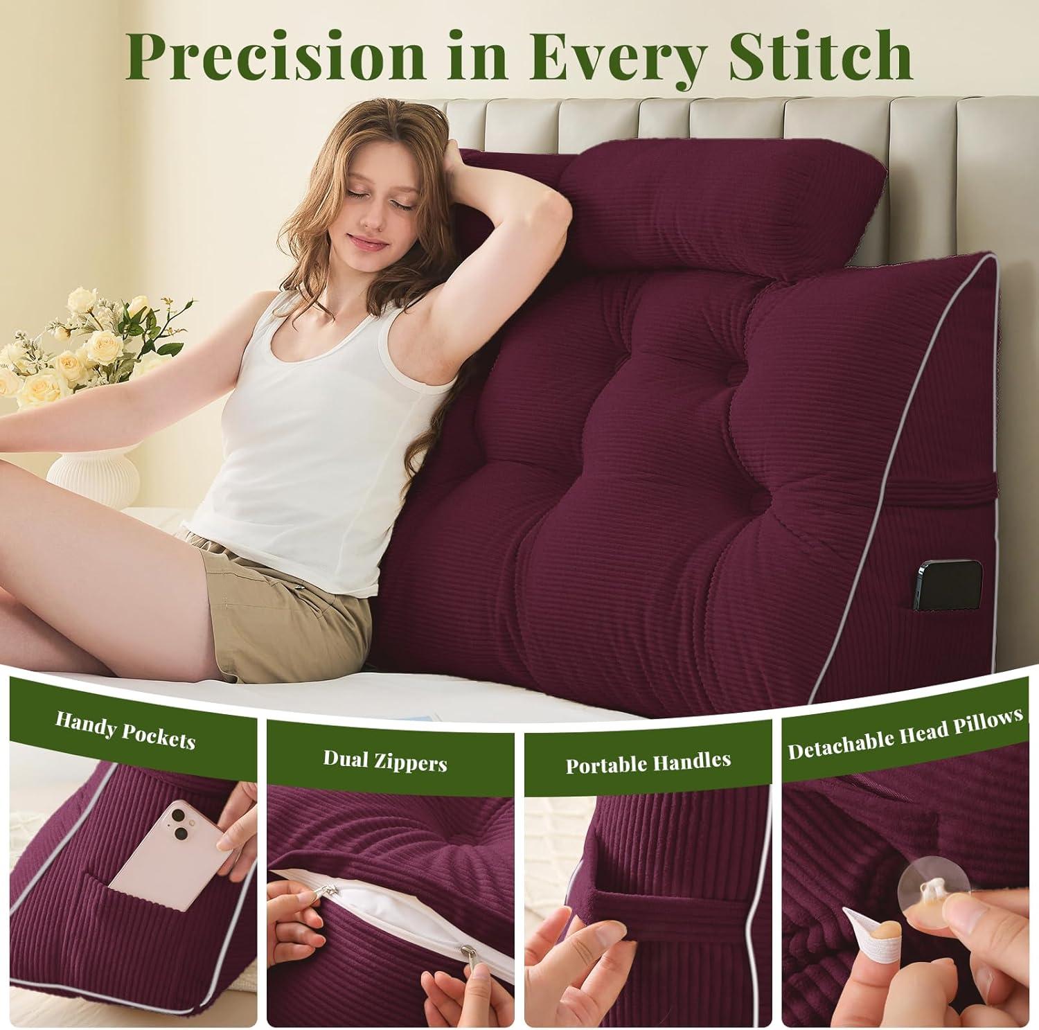 Sasttie Headboard Pillow Queen, Wedge Pillow Headboard for Bed Sitting Up, Back Support Pillows for Reading, Sitting or Working with Detachable 2 Pack Neck Bloster Pillows, Dark Grey(Wine)