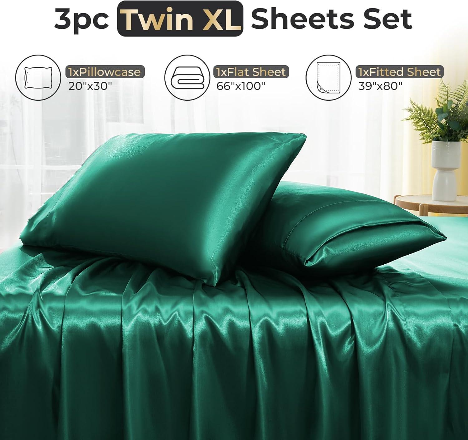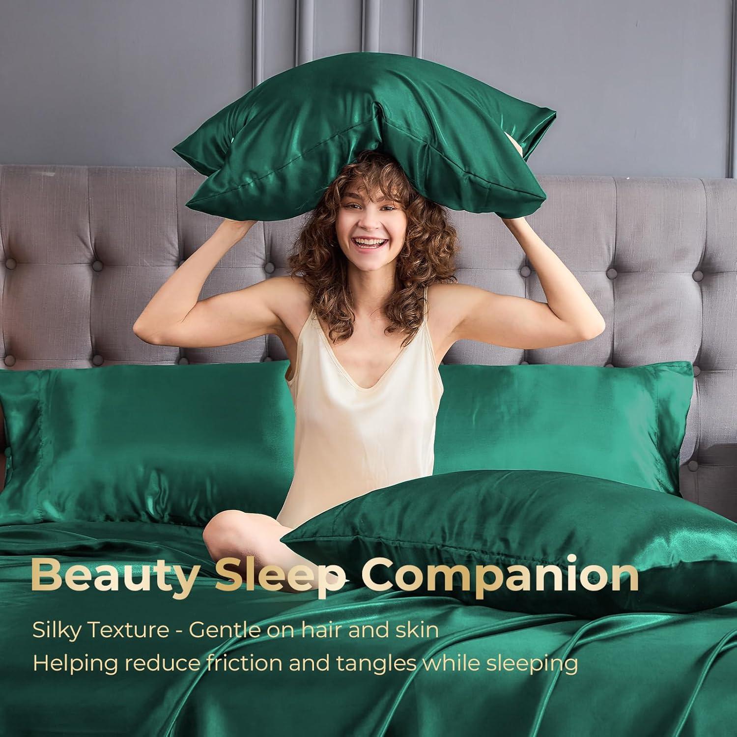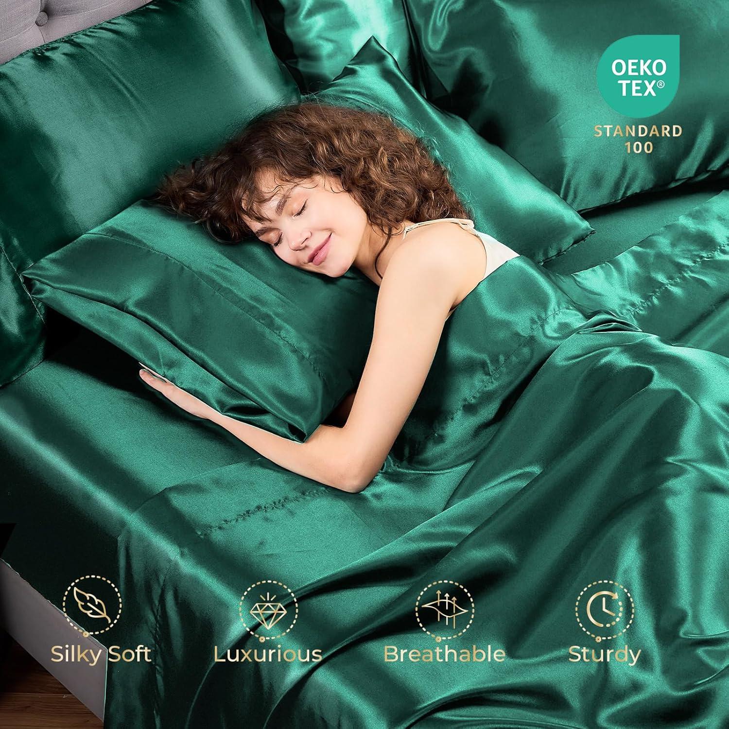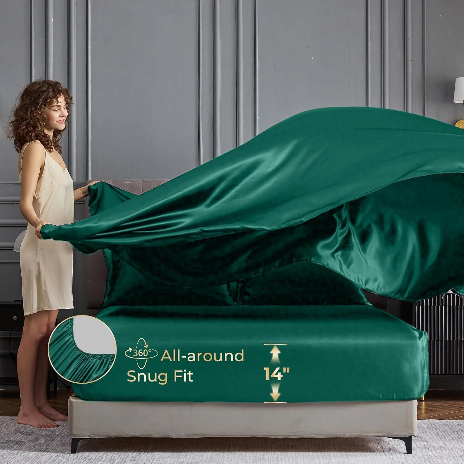 Sasttie Satin Sheets Queen Size – 4 Pieces Luxury Soft Pink Silky Bed Sheets Set with Pillowcases – Smooth Silk-Like Satin Fabric, Reinforced 14 Inches Pocket, Oeko-Tex Certified(Emerald Green)