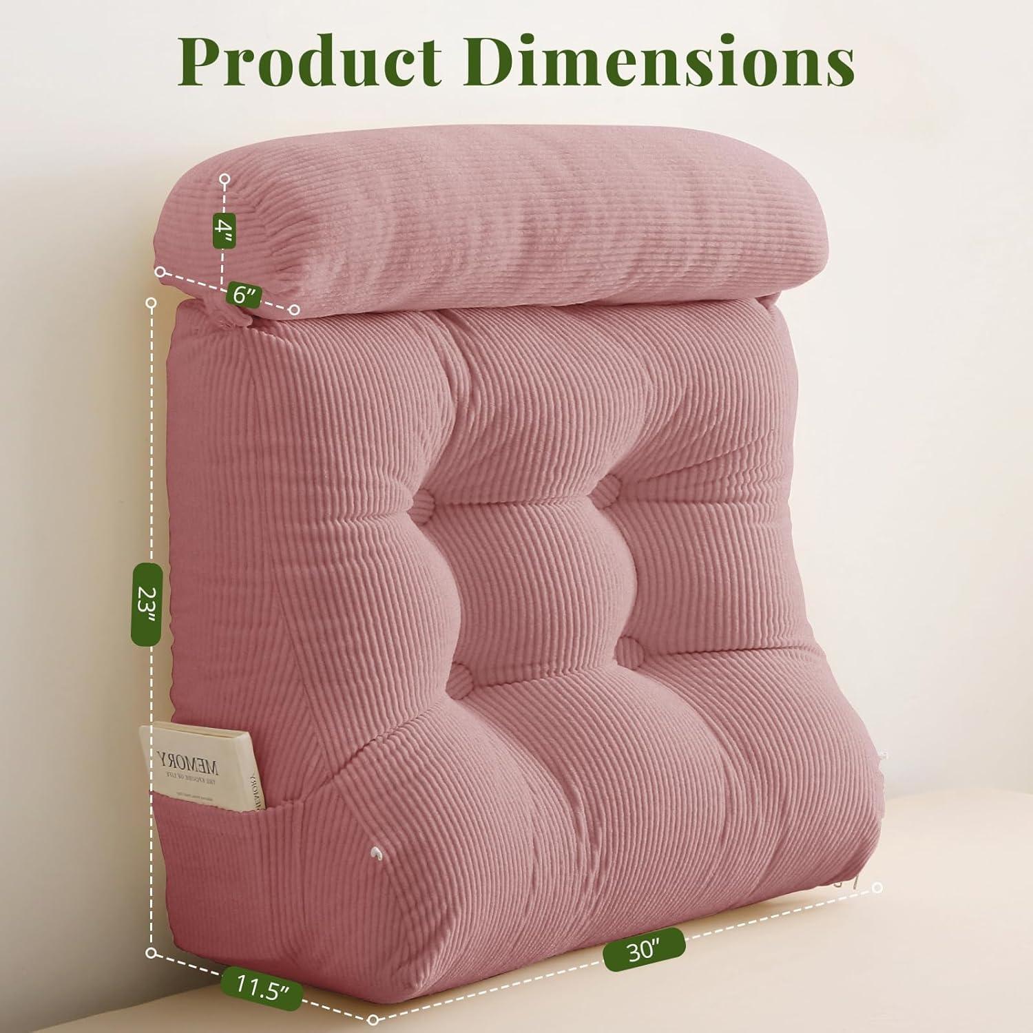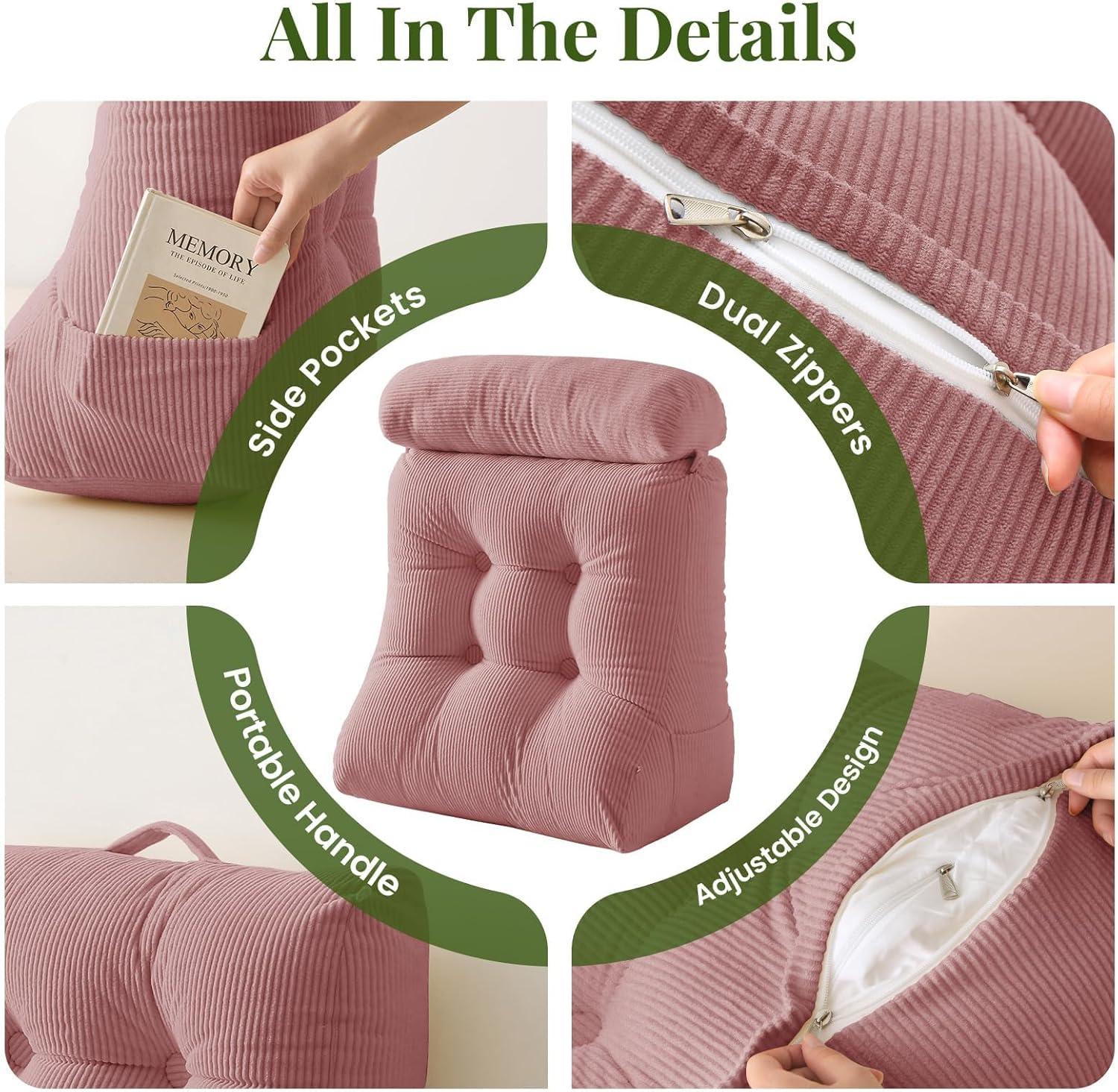 Convenient Design: Our wedge pillow headboard features a top handle for effortless carrying from bed to couch or room to room. 2 side pockets offer handy storage for phones, remotes, or glasses, keeping your essentials close and neatly organized