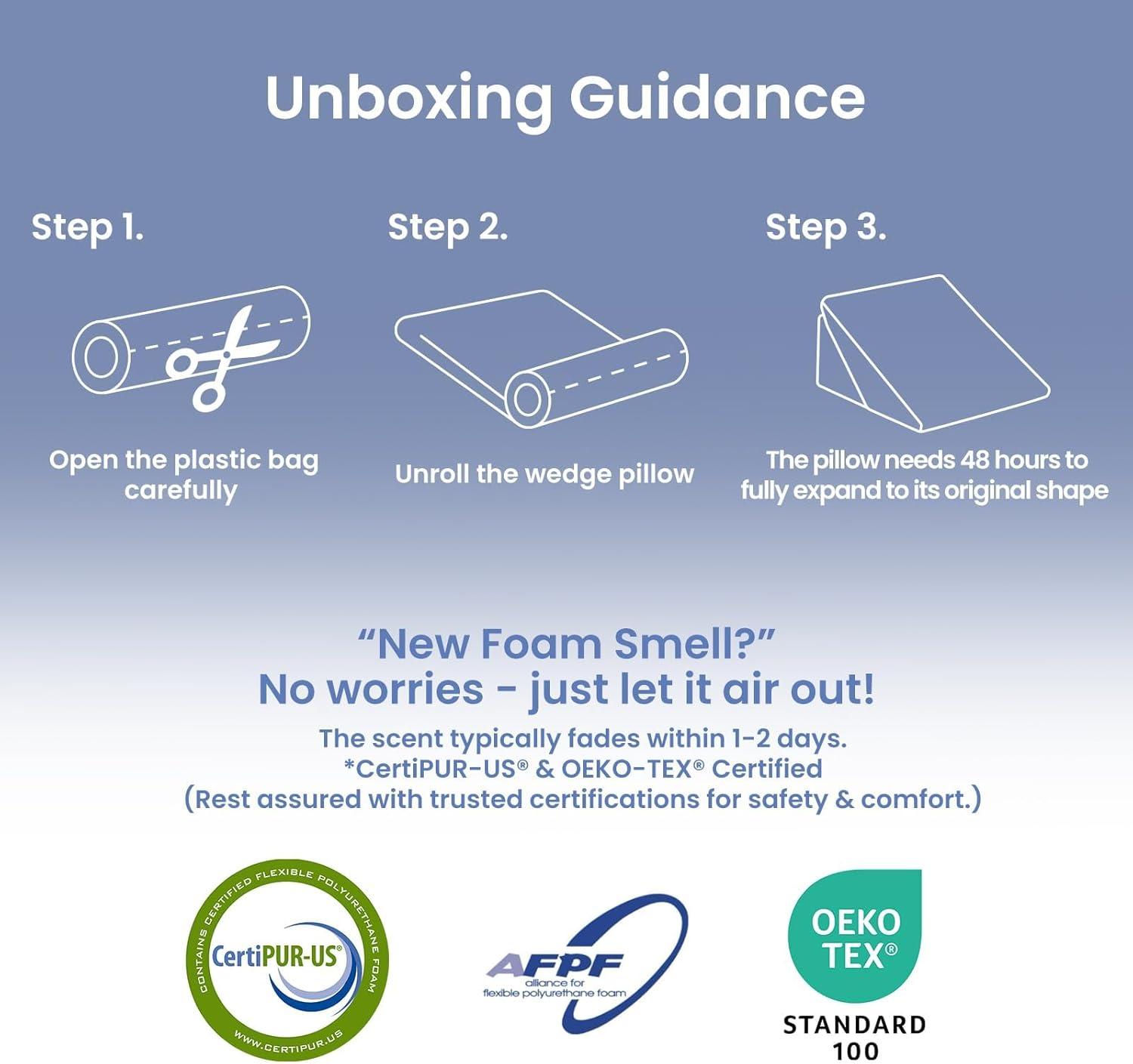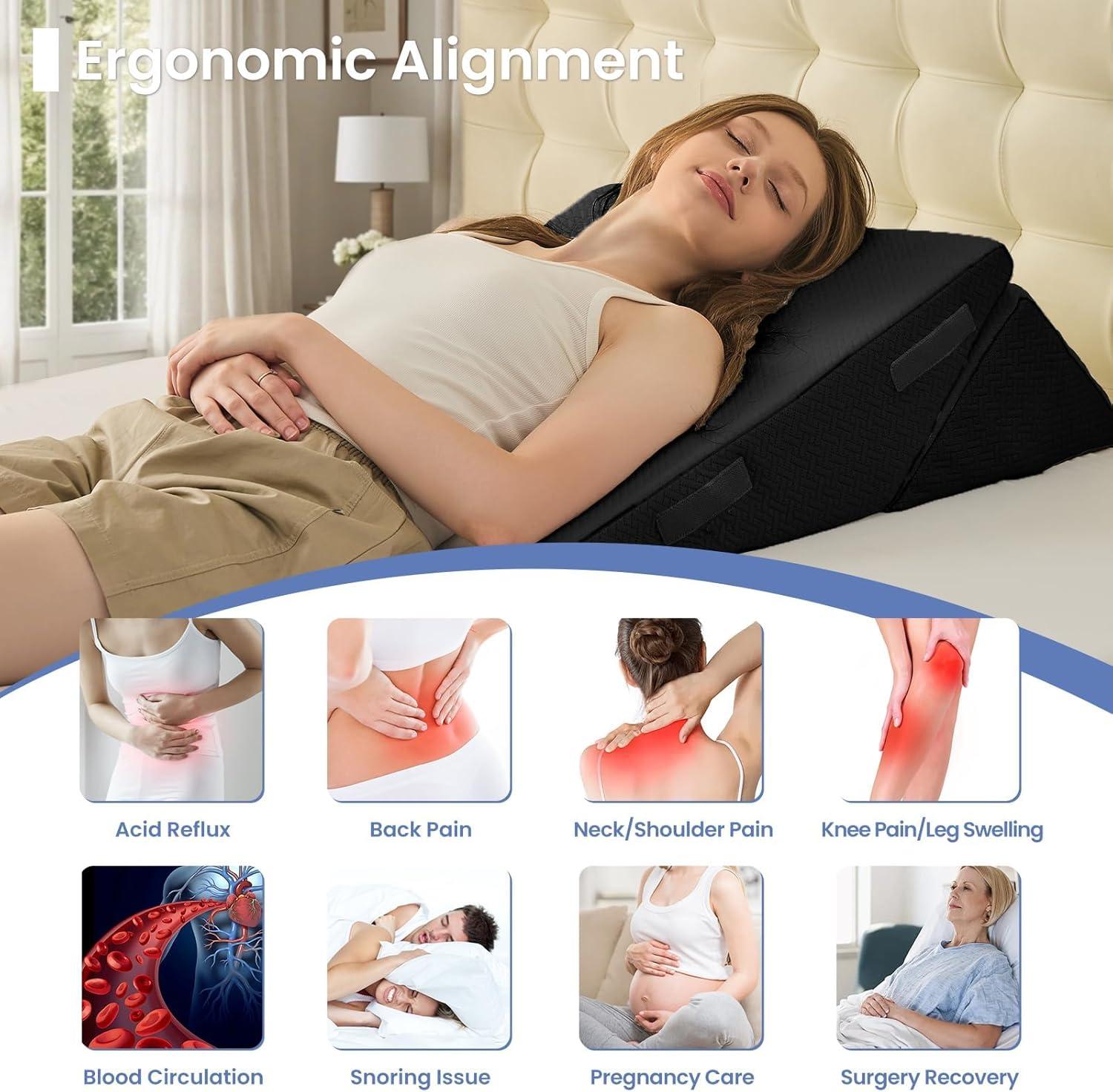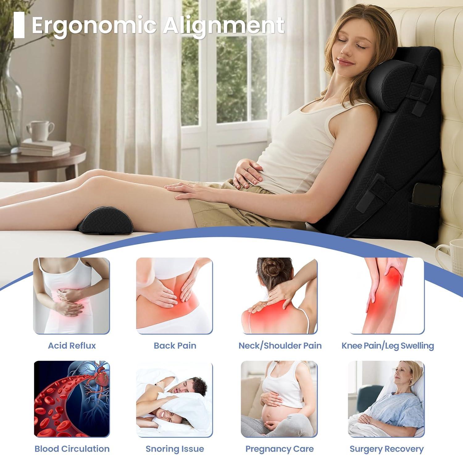 Multifunctional Wedge Pillow: This wedge pillow for sleeping helps reduce acid reflux, snoring, and heartburn through improved breathing and circulation. The pillow wedge also helps ease back, neck, and leg pressure, ideal for post-surgery recovery