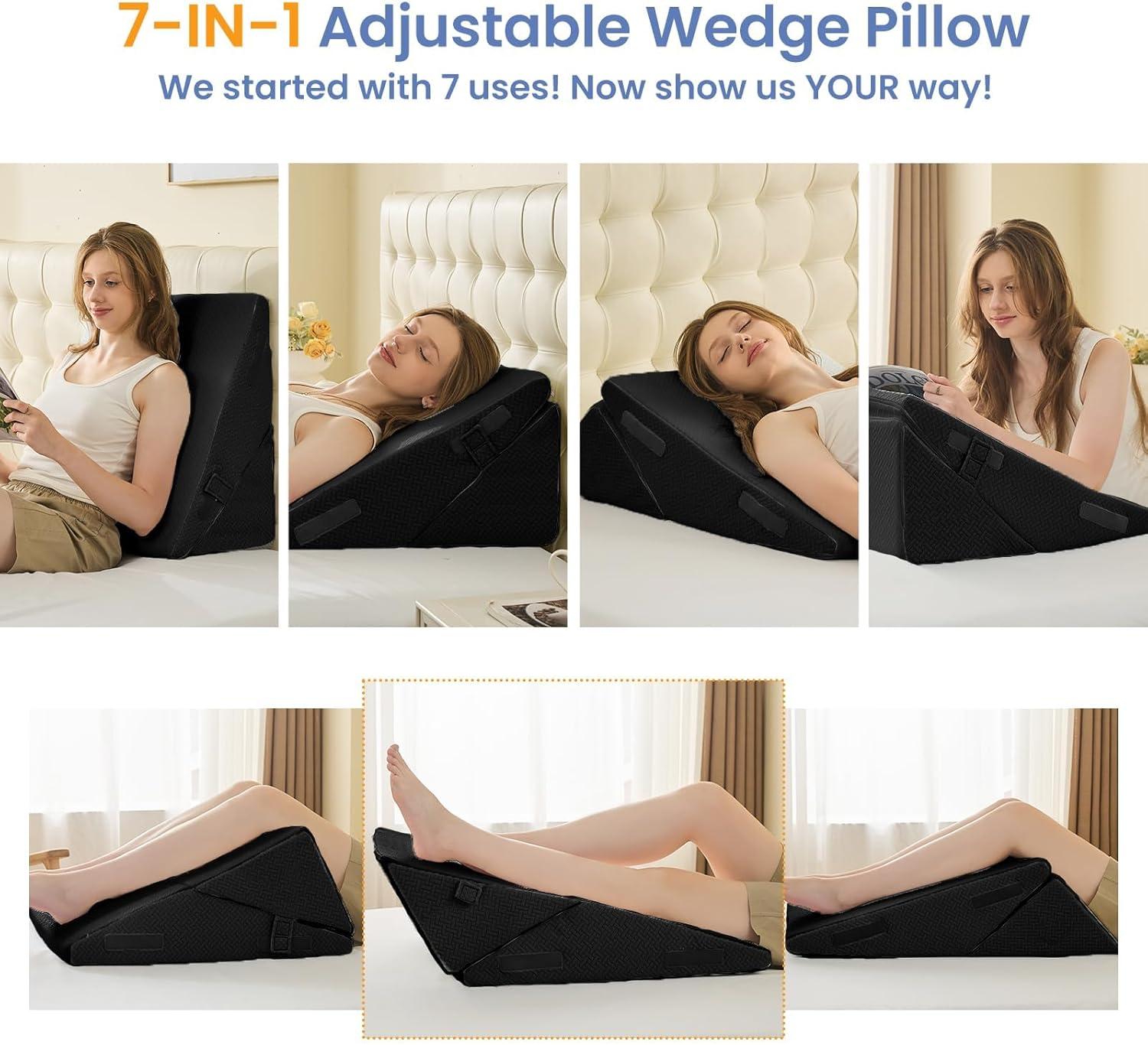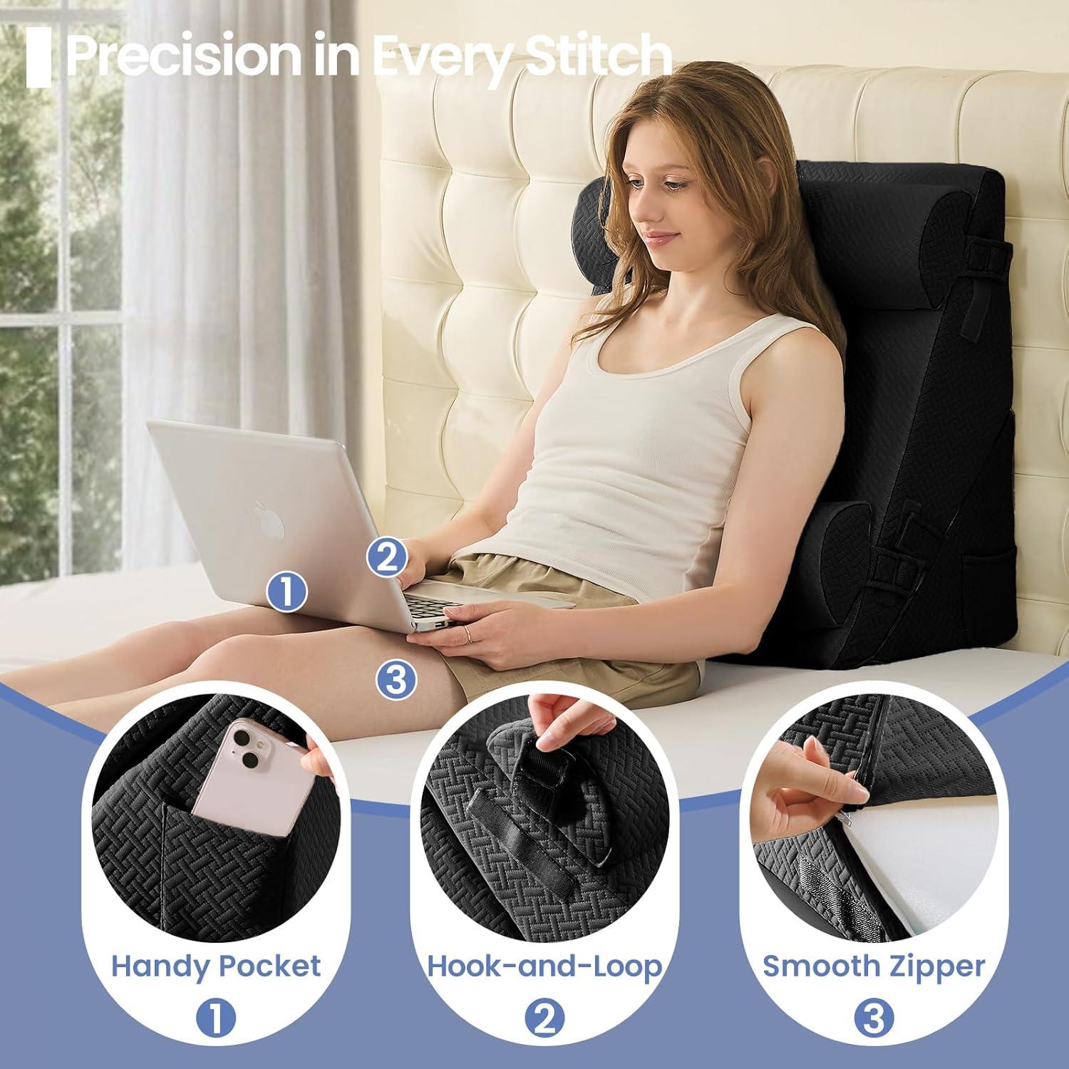 10-in-1 Adjustable Support: SASTTIE adjustable wedge pillow set switches between 9'' and 12'' to support your back, or to act as a reading pillow for bed. Linked by hook-and-loop, the memory foam detachable bolster offers targeted support for your neck