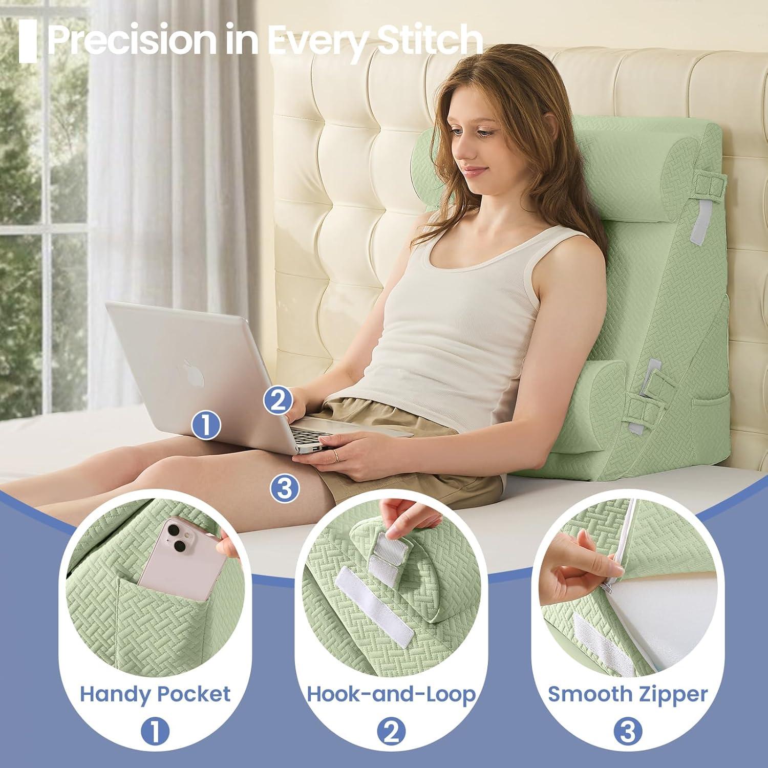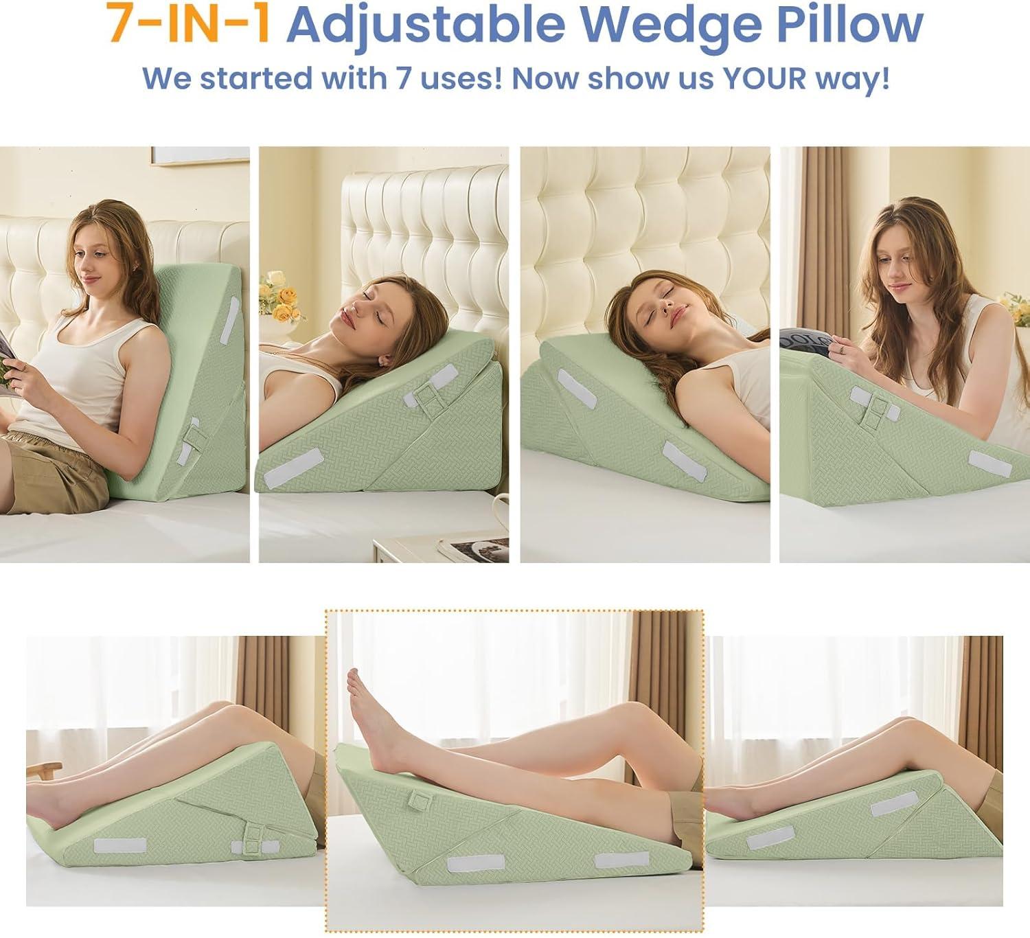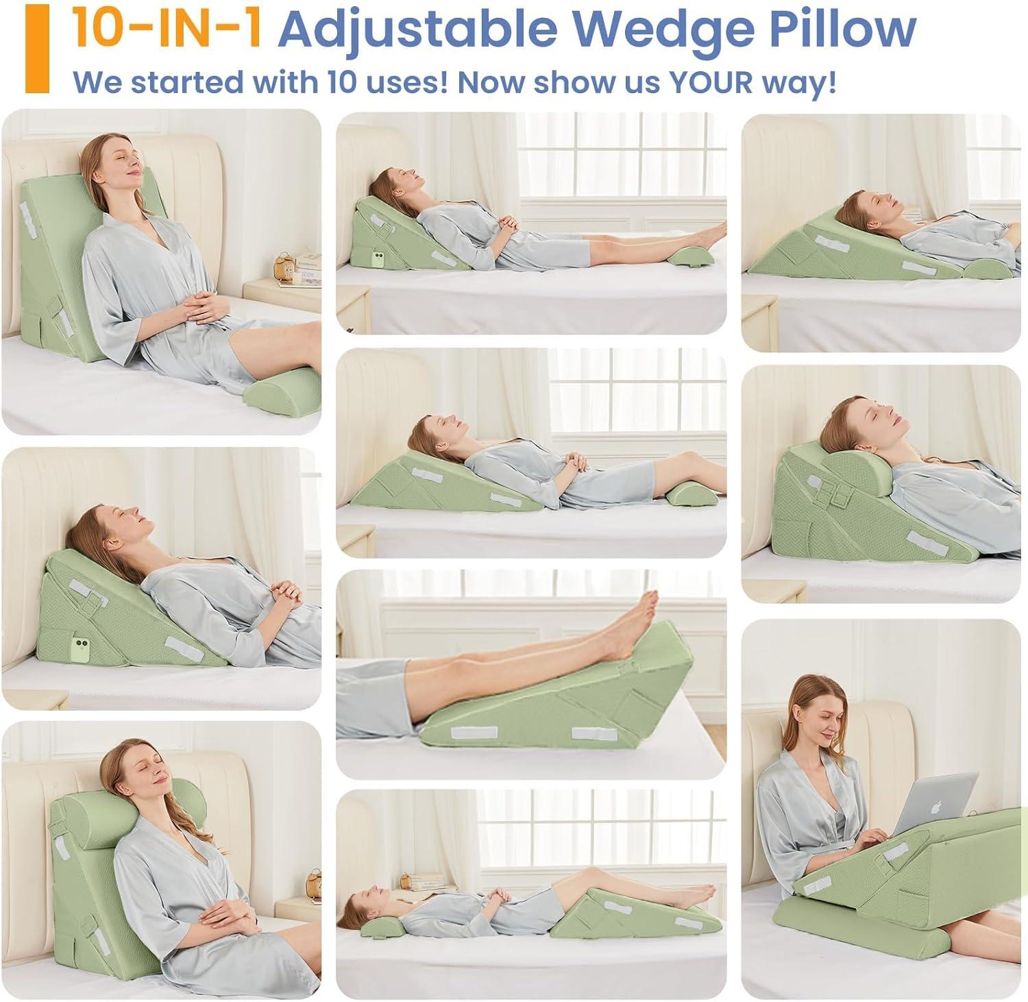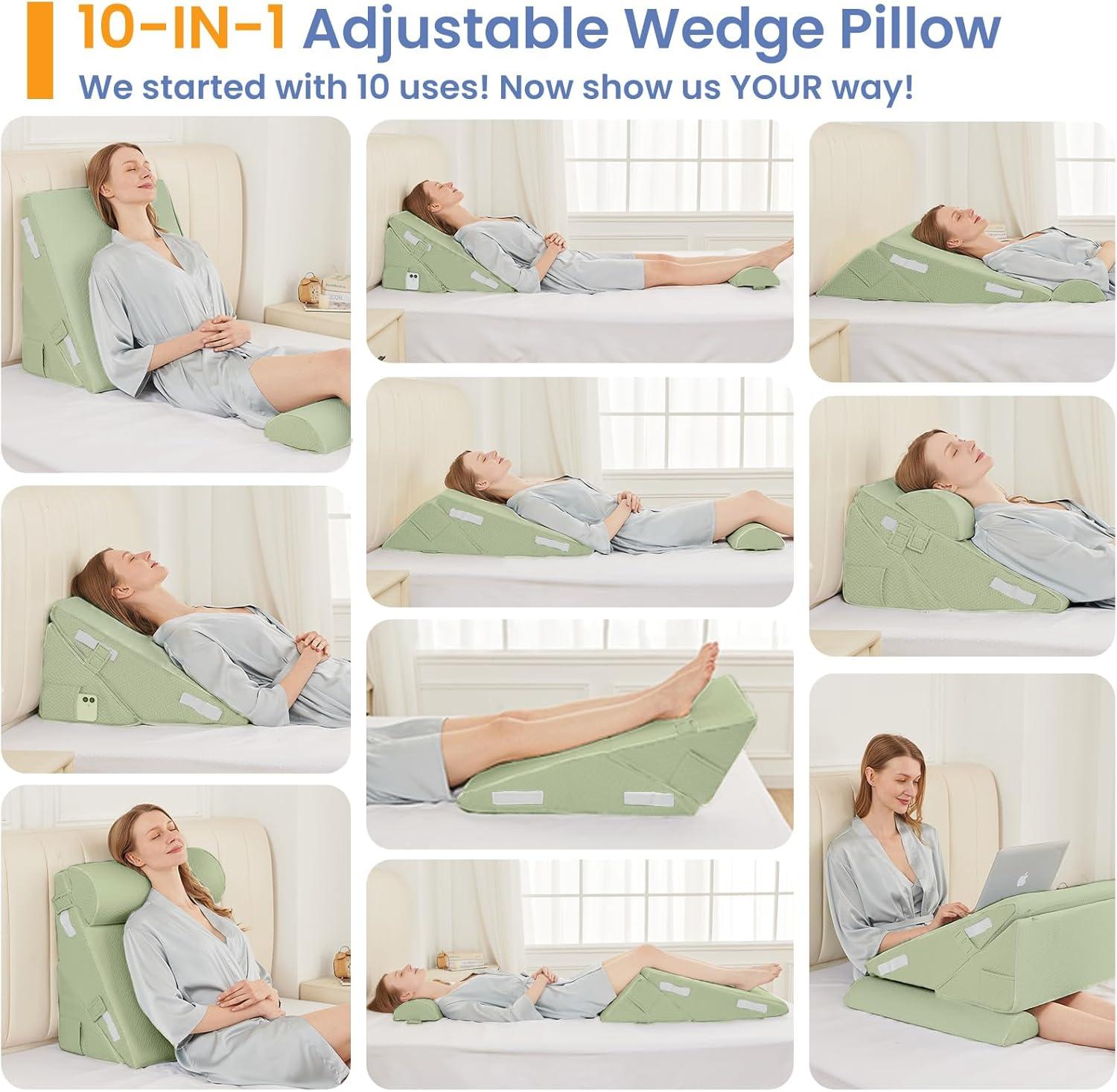 10-in-1 Adjustable Support: SASTTIE adjustable wedge pillow set switches between 9'' and 12'' to support your back, or to act as a reading pillow for bed. Linked by hook-and-loop, the memory foam detachable bolster offers targeted support for your neck
