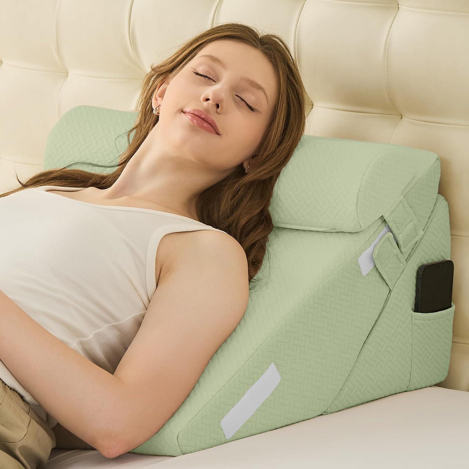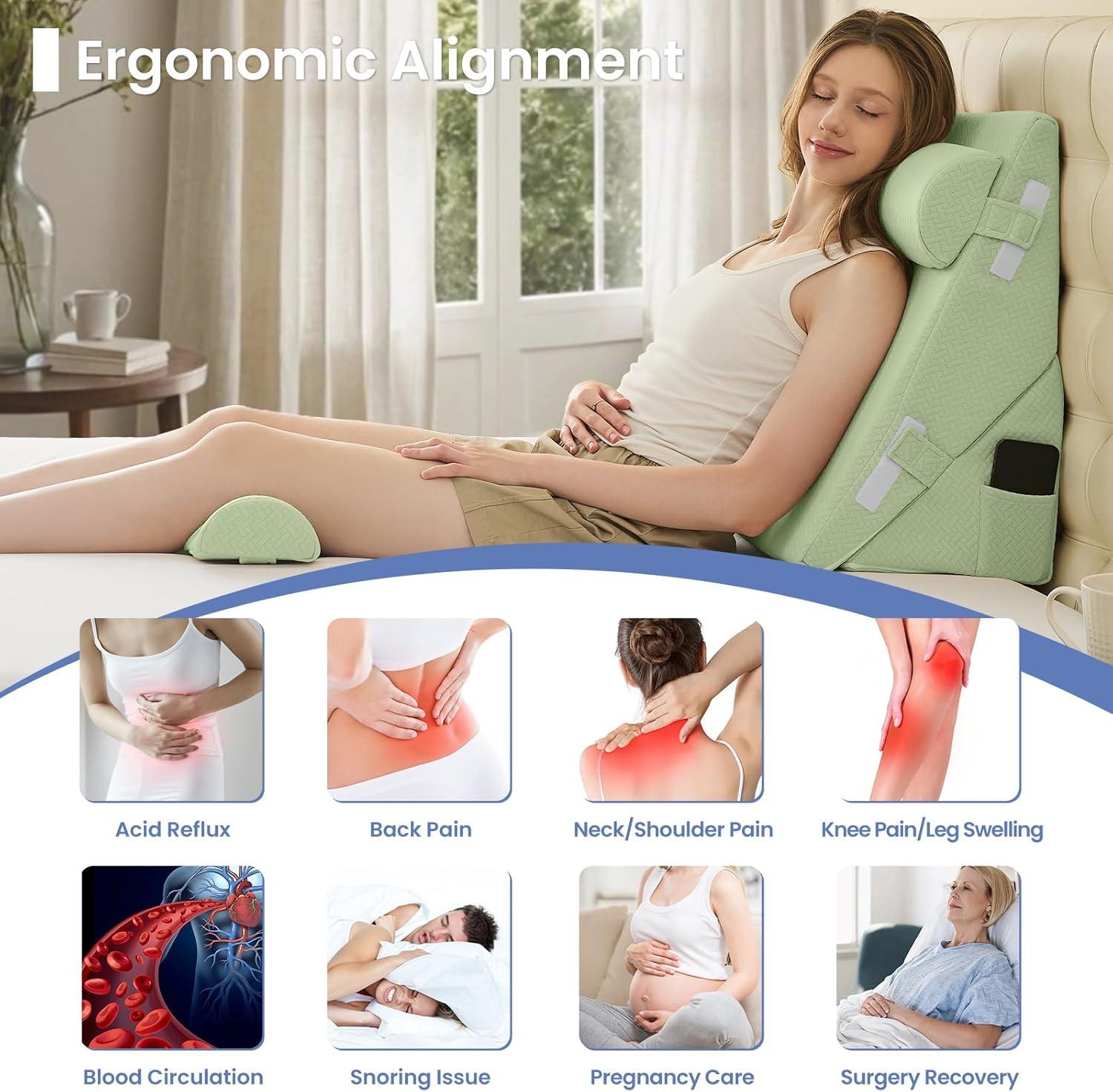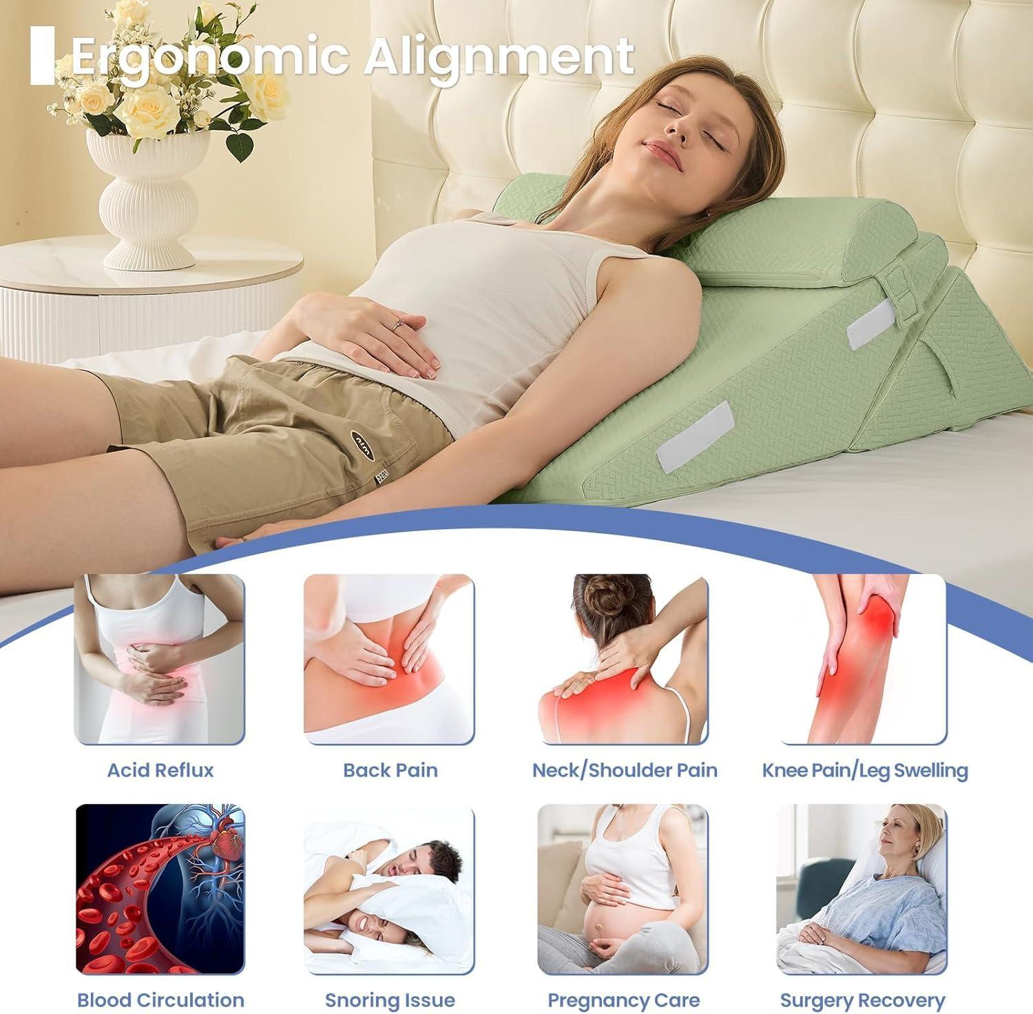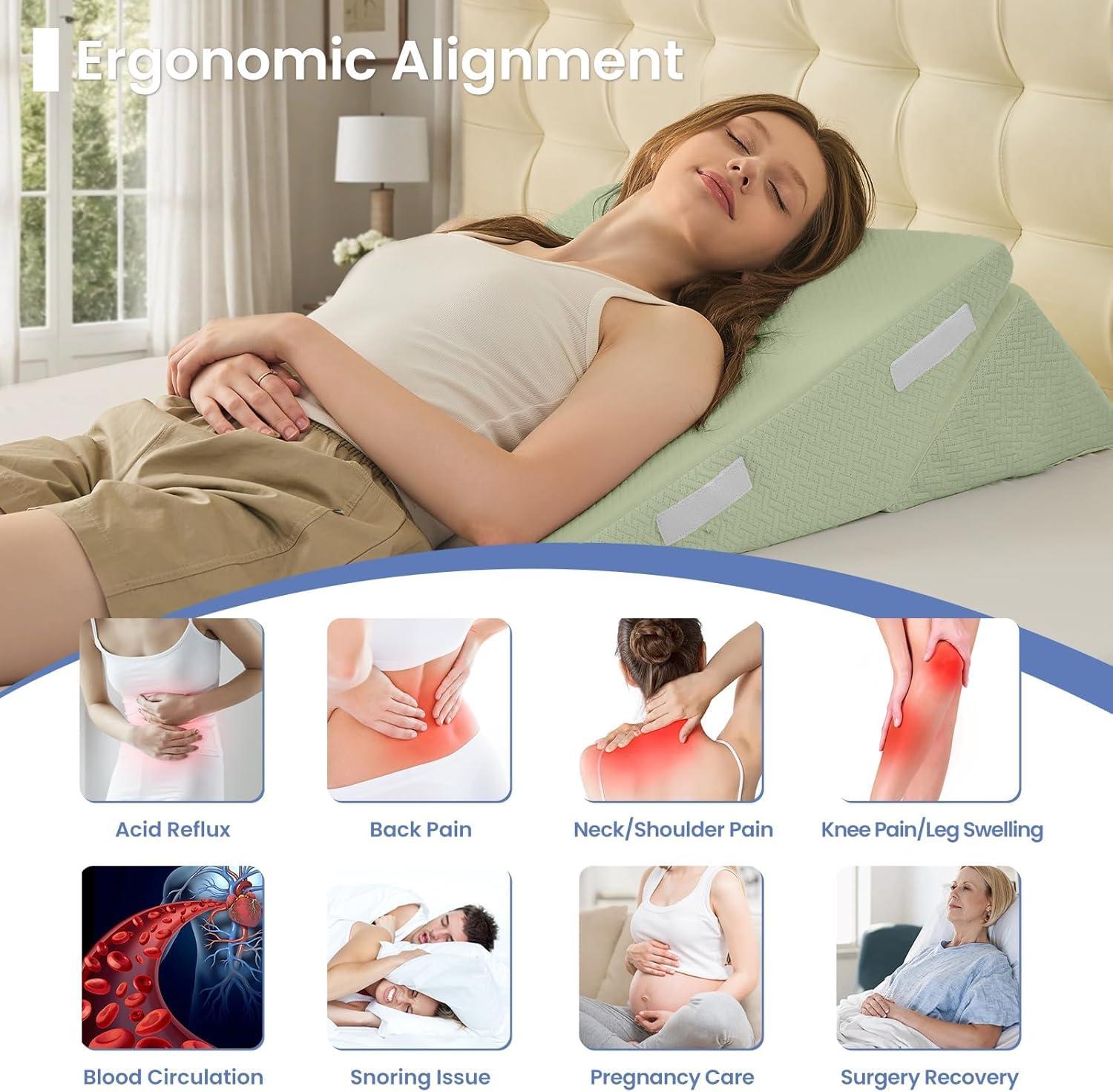 Multifunctional Wedge Pillow: This wedge pillow for sleeping helps reduce acid reflux, snoring, and heartburn through improved breathing and circulation. The pillow wedge also helps ease back, neck, and leg pressure, ideal for post-surgery recovery
