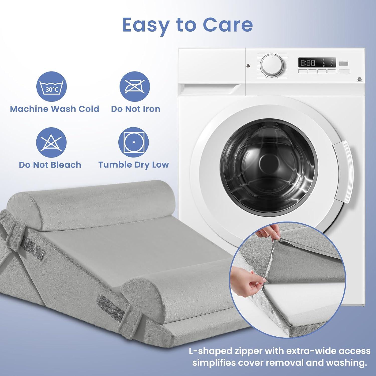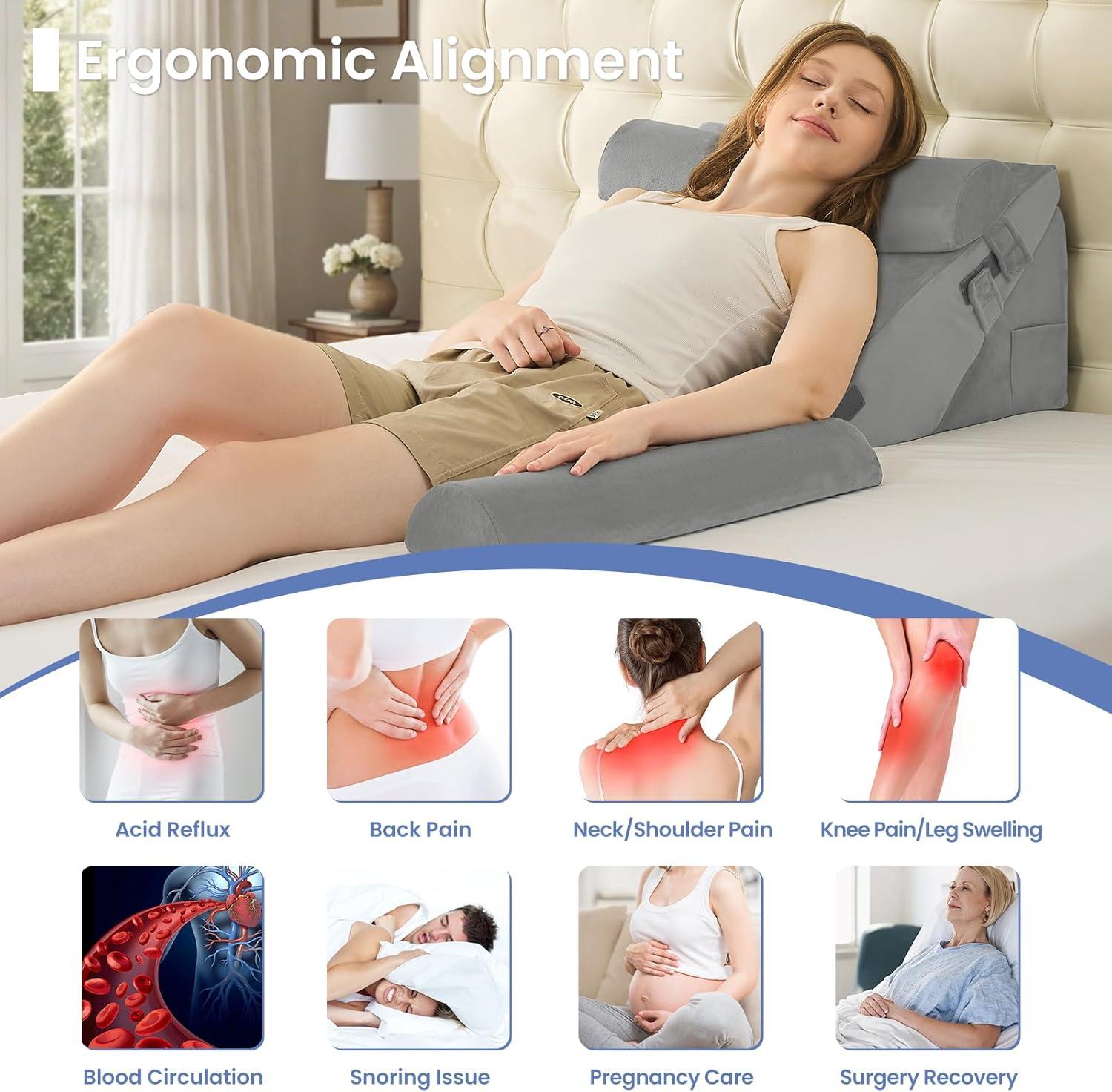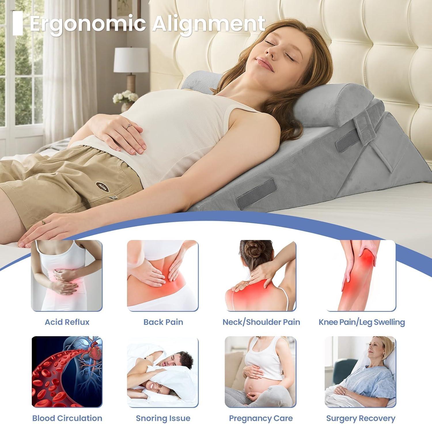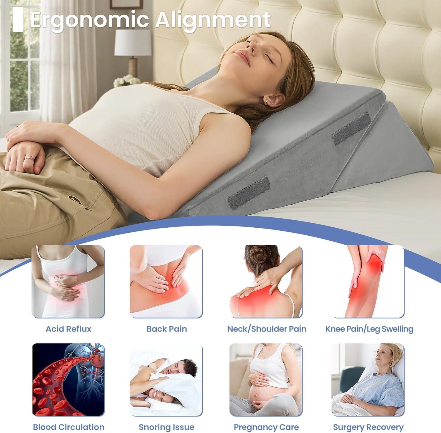 Multifunctional Wedge Pillow: This wedge pillow for sleeping helps reduce acid reflux, snoring, and heartburn through improved breathing and circulation. The pillow wedge also helps ease back, neck, and leg pressure, ideal for post-surgery recovery