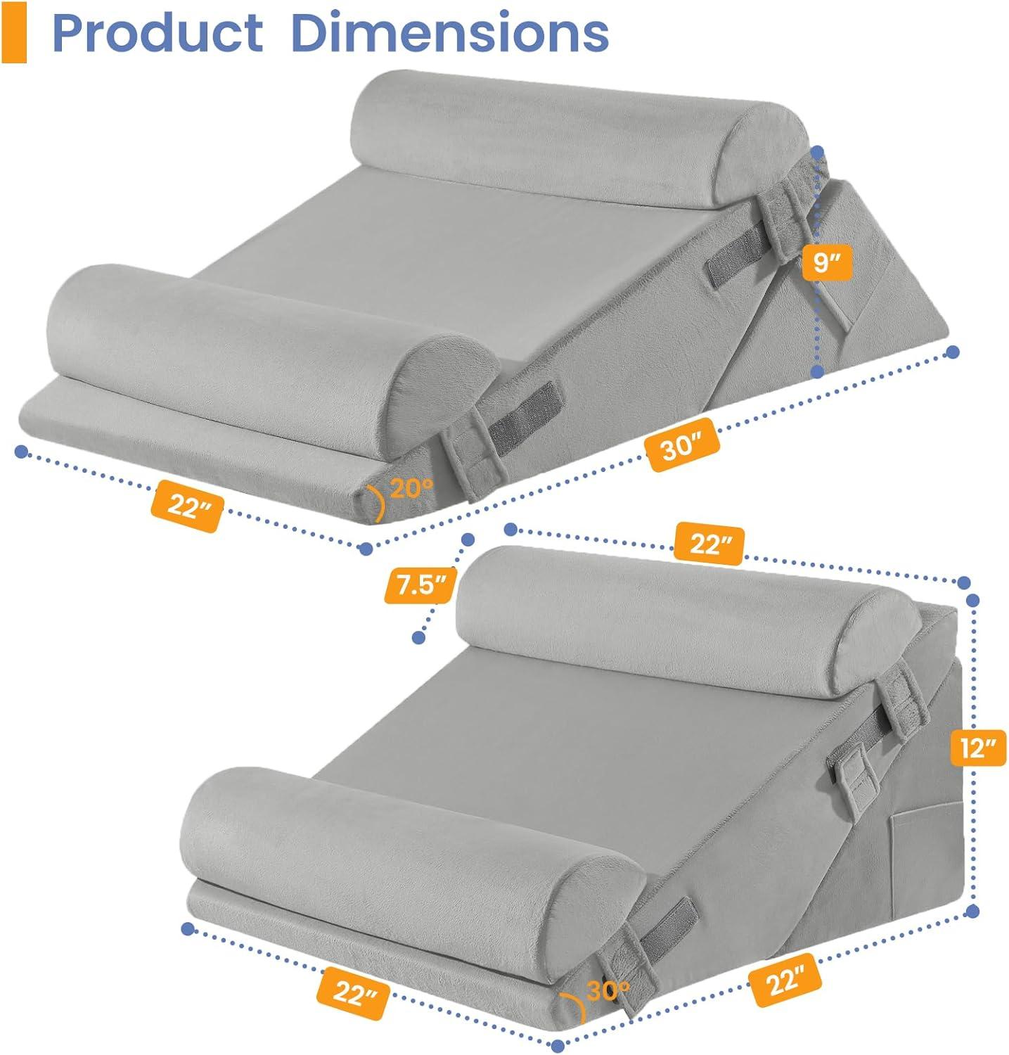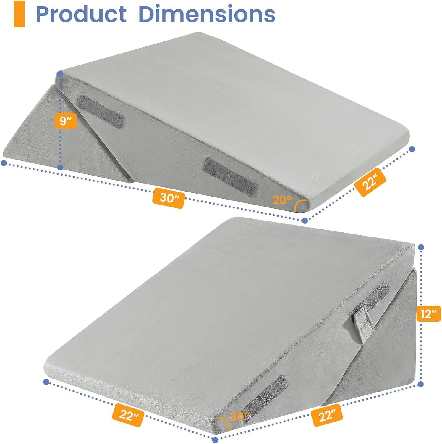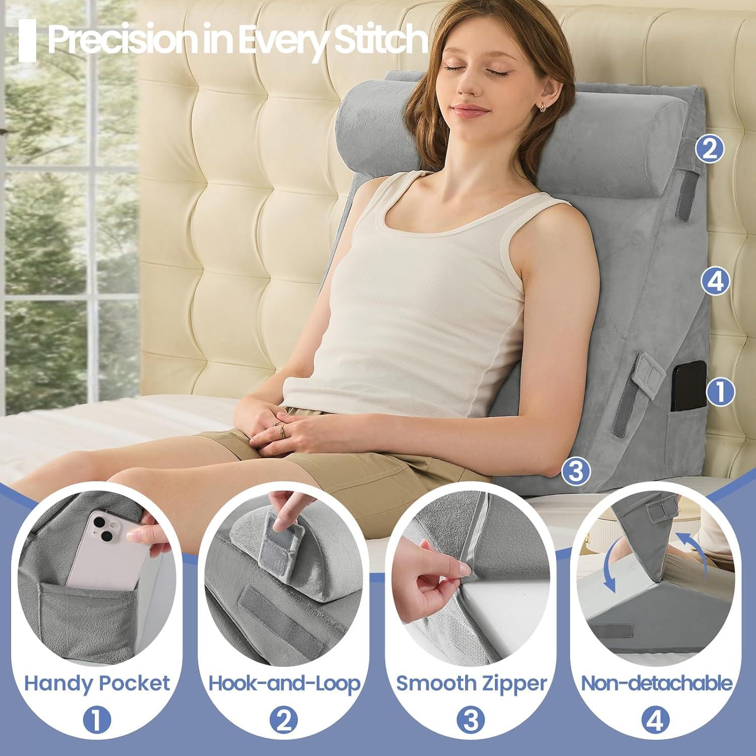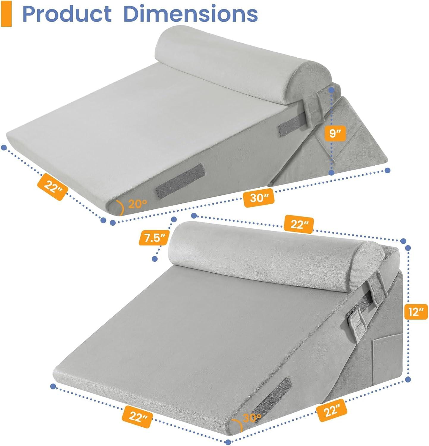 Sasttie Wedge Pillow Set for After Surgery, 3PCS Adjustable Bed Wedge Pillow Headboard with Memory Foam Neck Cushion – for Acid Reflux, Sleeping, Neck & Back Support, Dark Grey & White(Velvet – Light Grey)