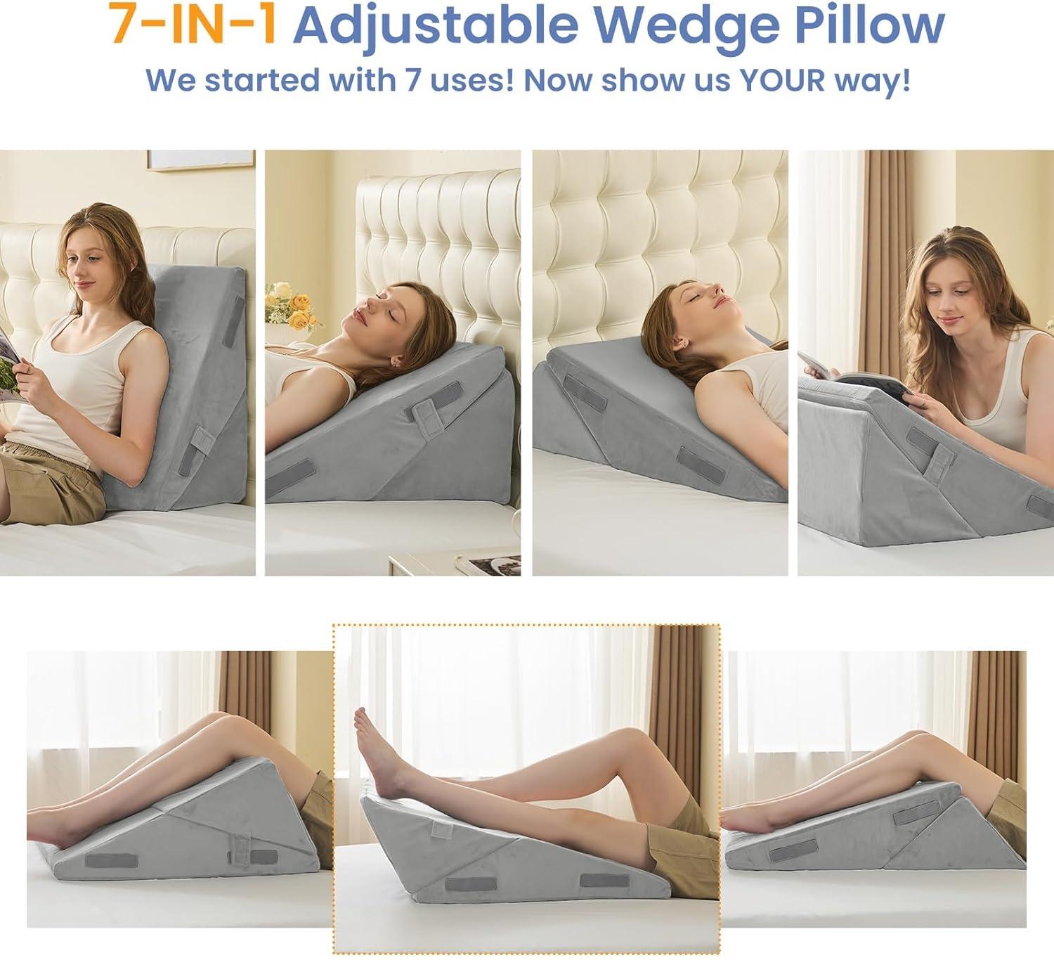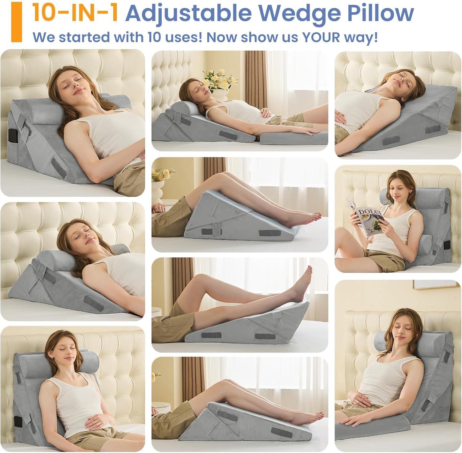 10-in-1 Adjustable Support: SASTTIE adjustable wedge pillow set switches between 9'' and 12'' to support your back, or to act as a reading pillow for bed. Linked by hook-and-loop, the memory foam detachable bolster offers targeted support for your neck